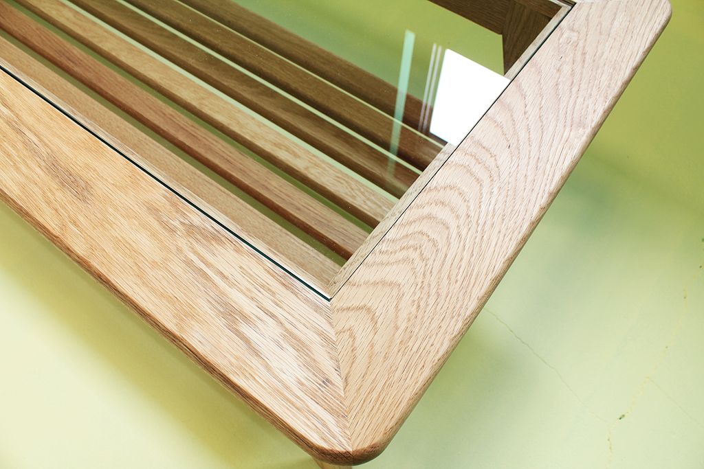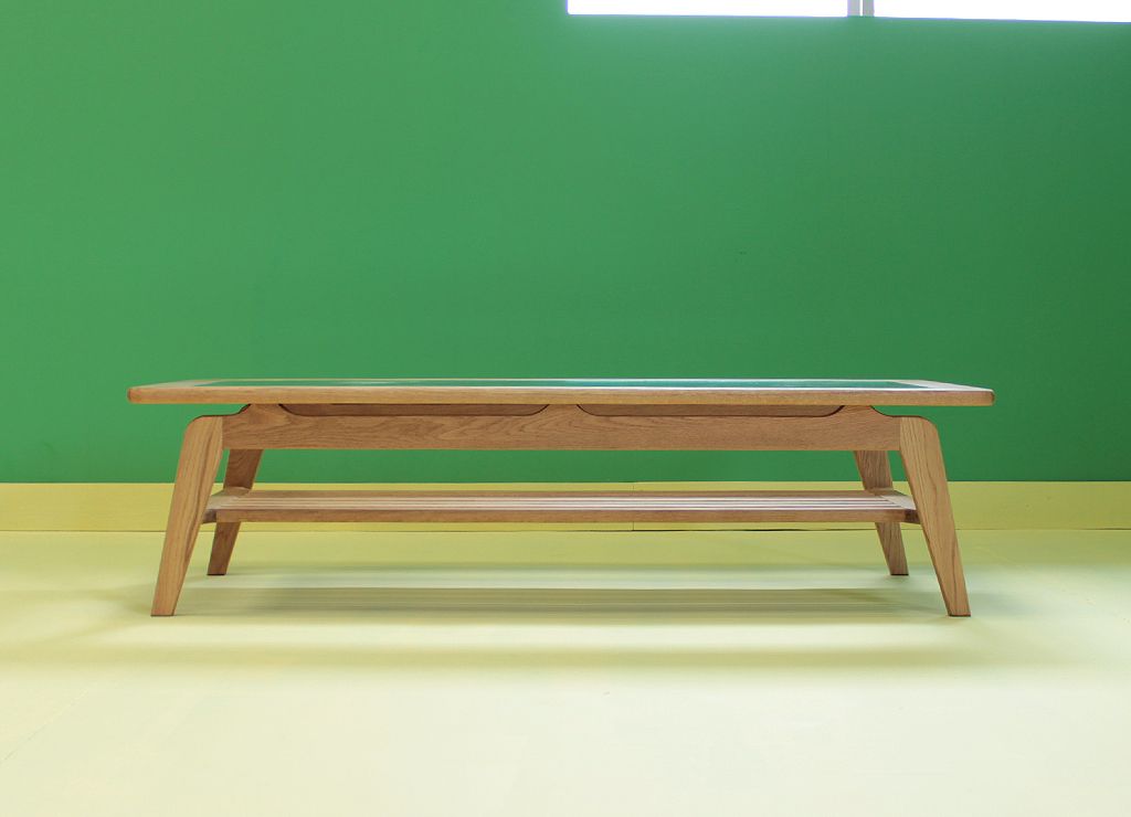 上質なオークと分厚く透明度の高いガラスを使った大きなコーヒーテーブル。