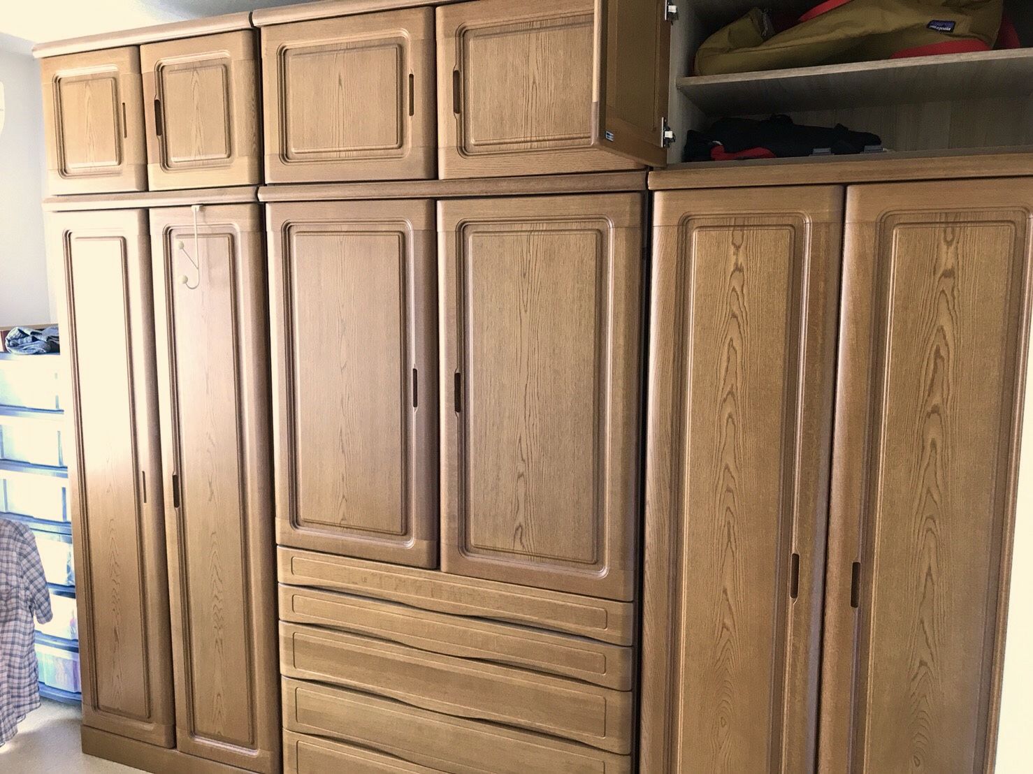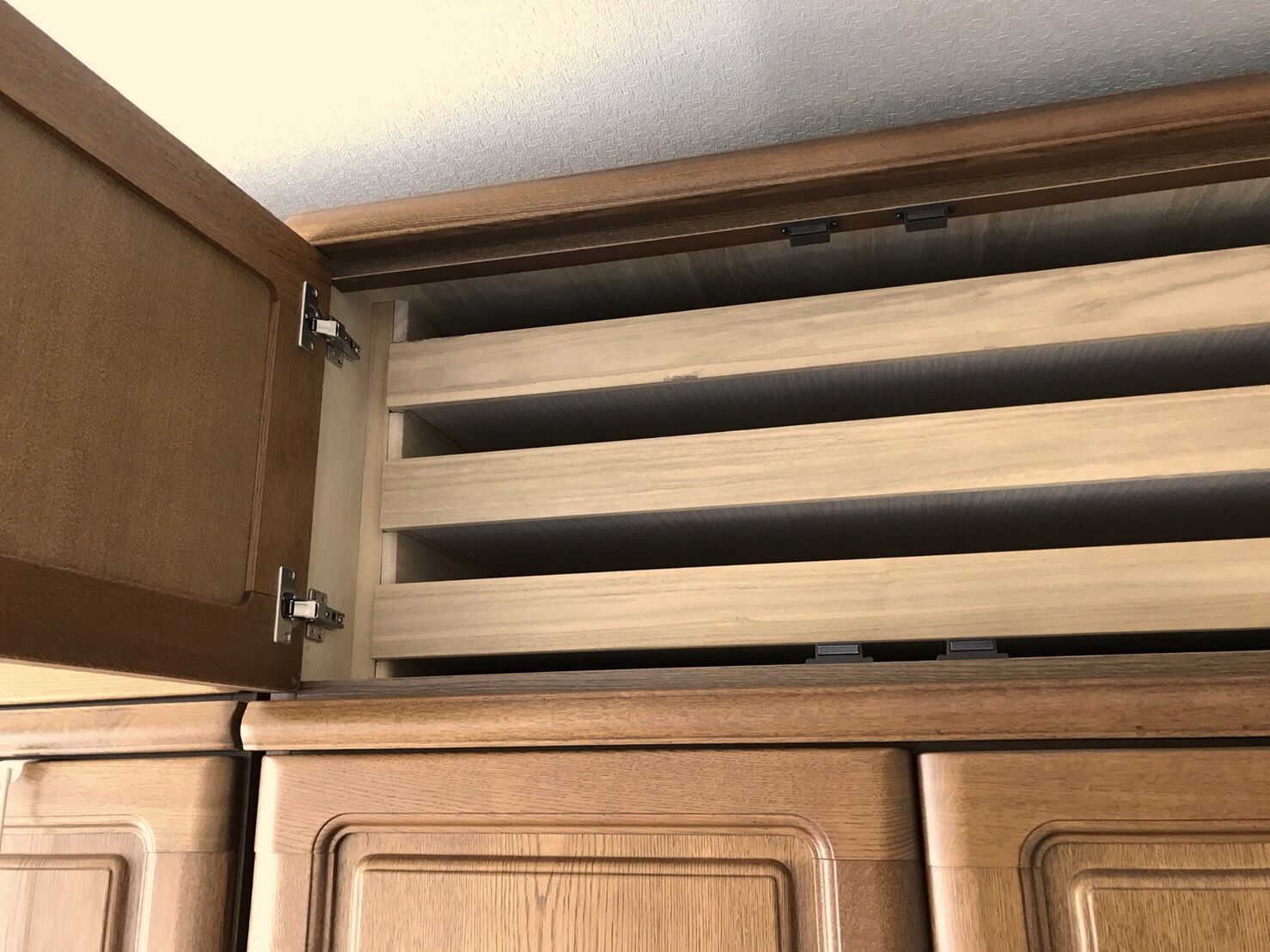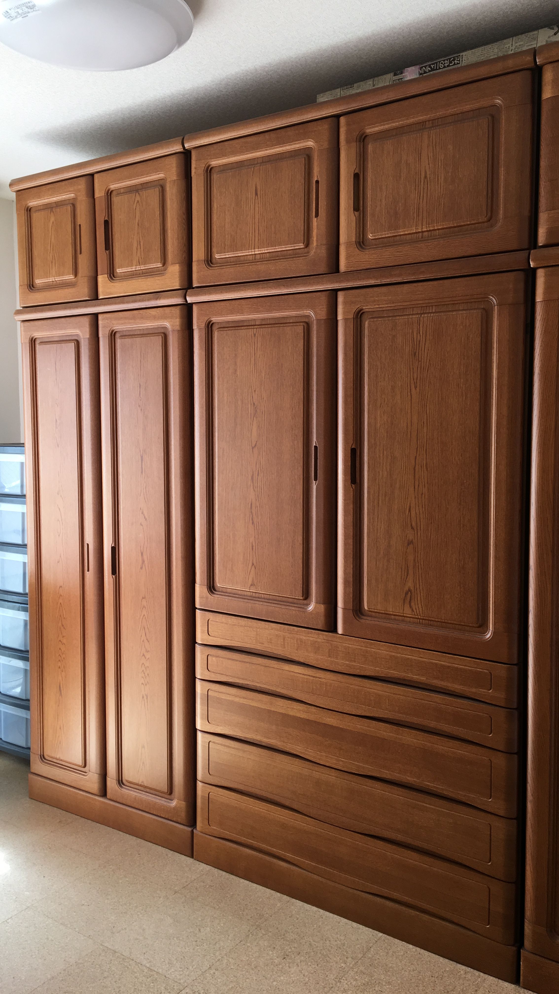 ↓の写真のように、真ん中のブレザー箪笥の上部と下部をくっつけた、ウォークインクローゼット内に置いて和箪笥として使えるようなキャビネットと、左右二つの上置き部分を使ったテレビボードなどの製作をご希望でした。