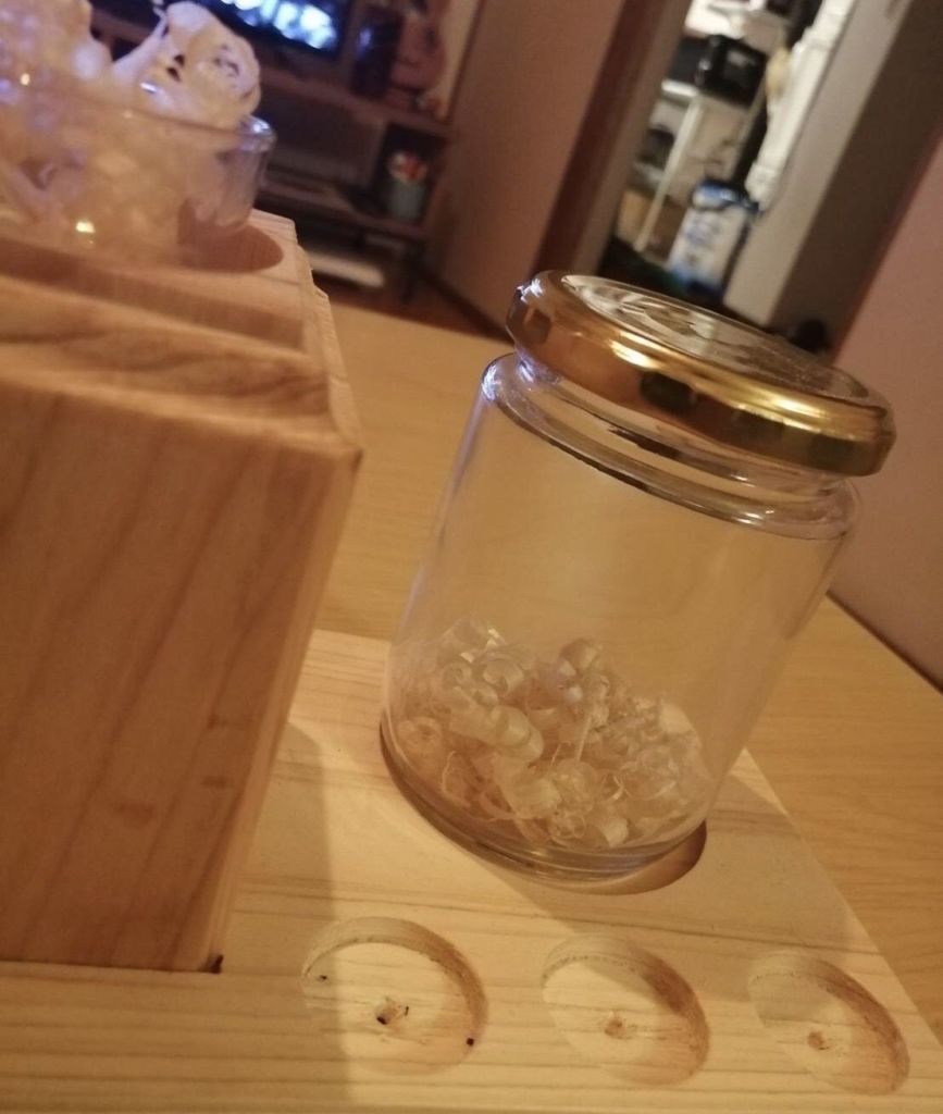 そして削ったカンナ屑を後ろのビンにストックしておけば