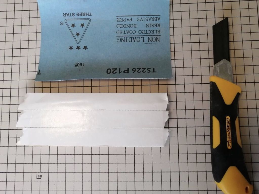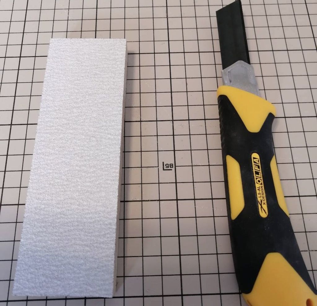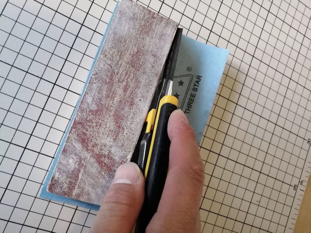 カッターナイフで、刃を少し長めに出して材料に沿わせて残りの紙やすりを切り落とします