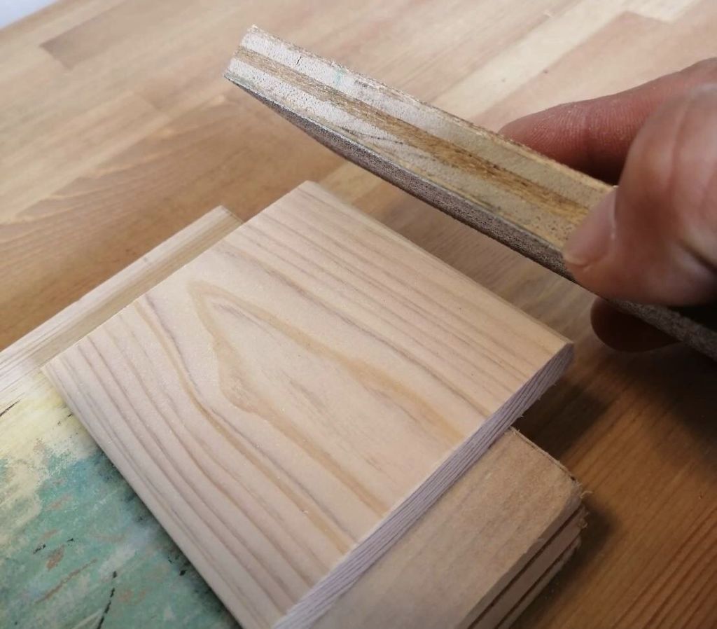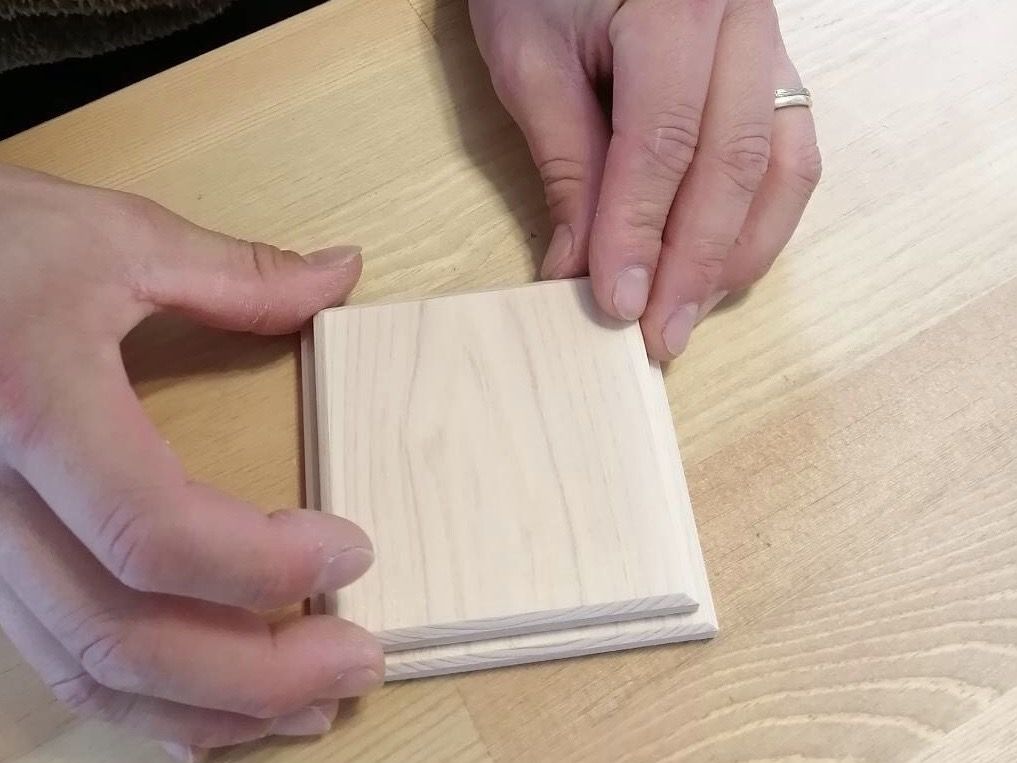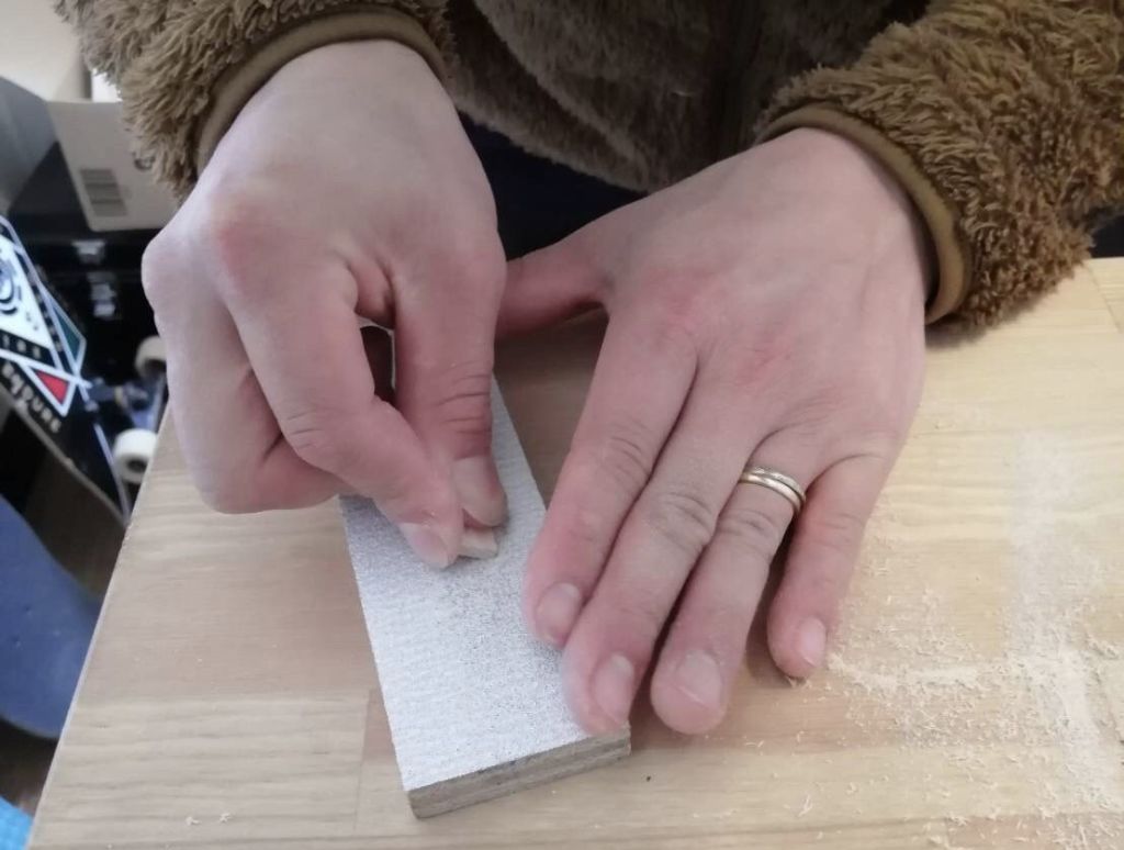 先ほど切った9センチ×9センチと、8センチ×8センチの板の角に、斜め45度(だいたいね)に紙やすりを当てながら45度をキープしつつ前後にこすります