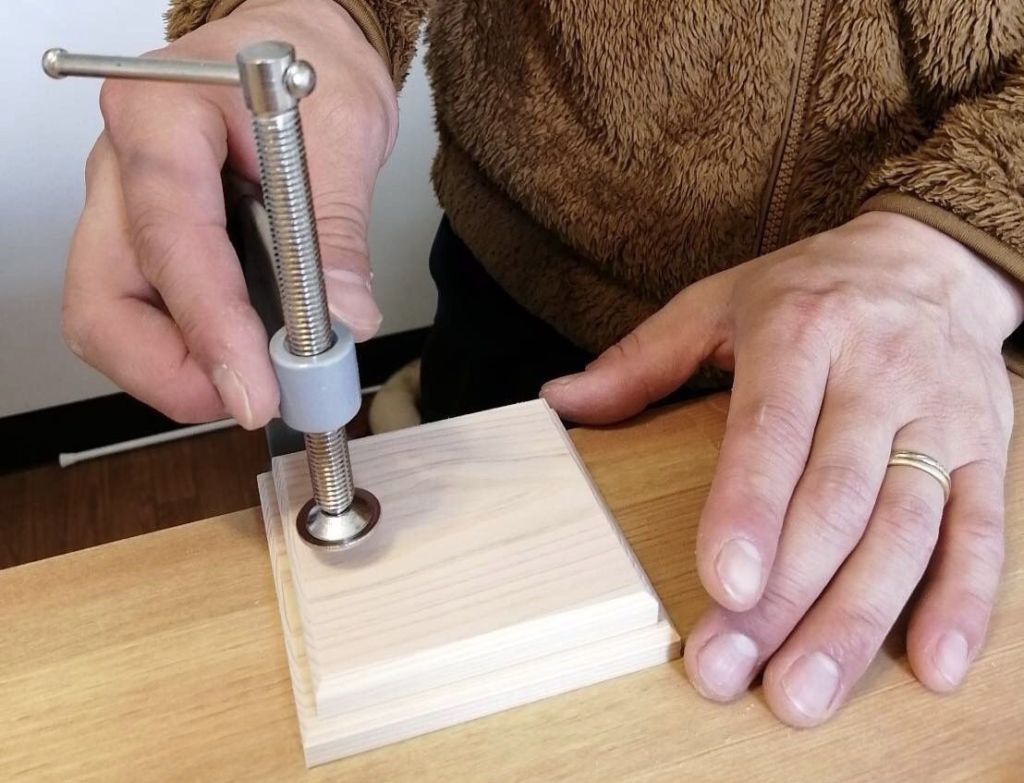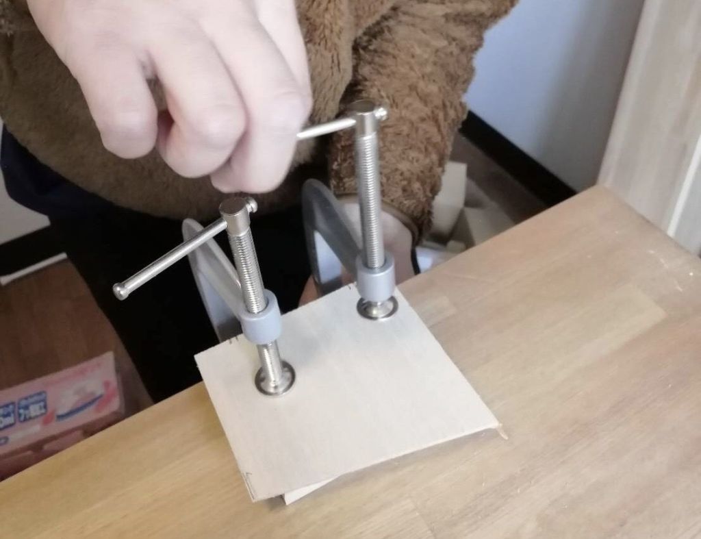 しかし直接クランプすると材料に跡がつくので、一枚なにか当ててクランプします!