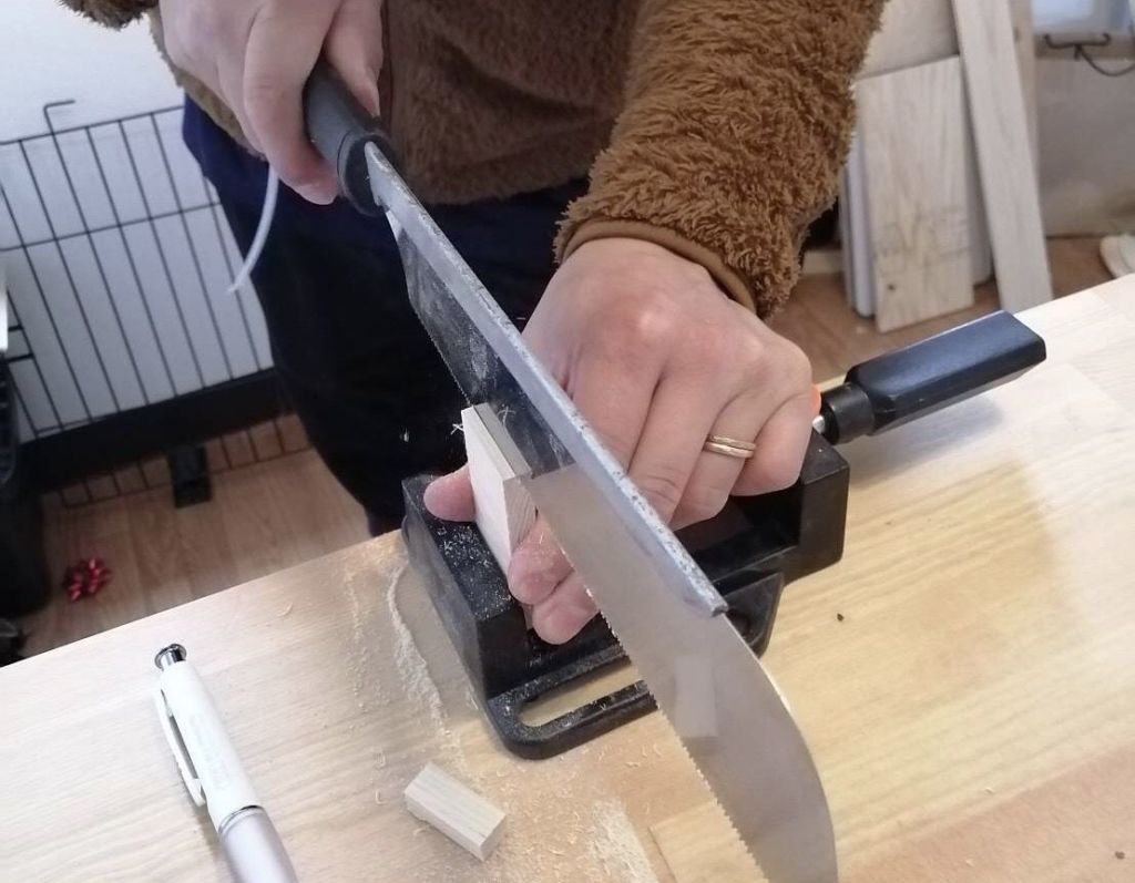 そしてこれを先ほど同様に斜め45度に削るんですが、今度は紙やすりを下において材料を動かします