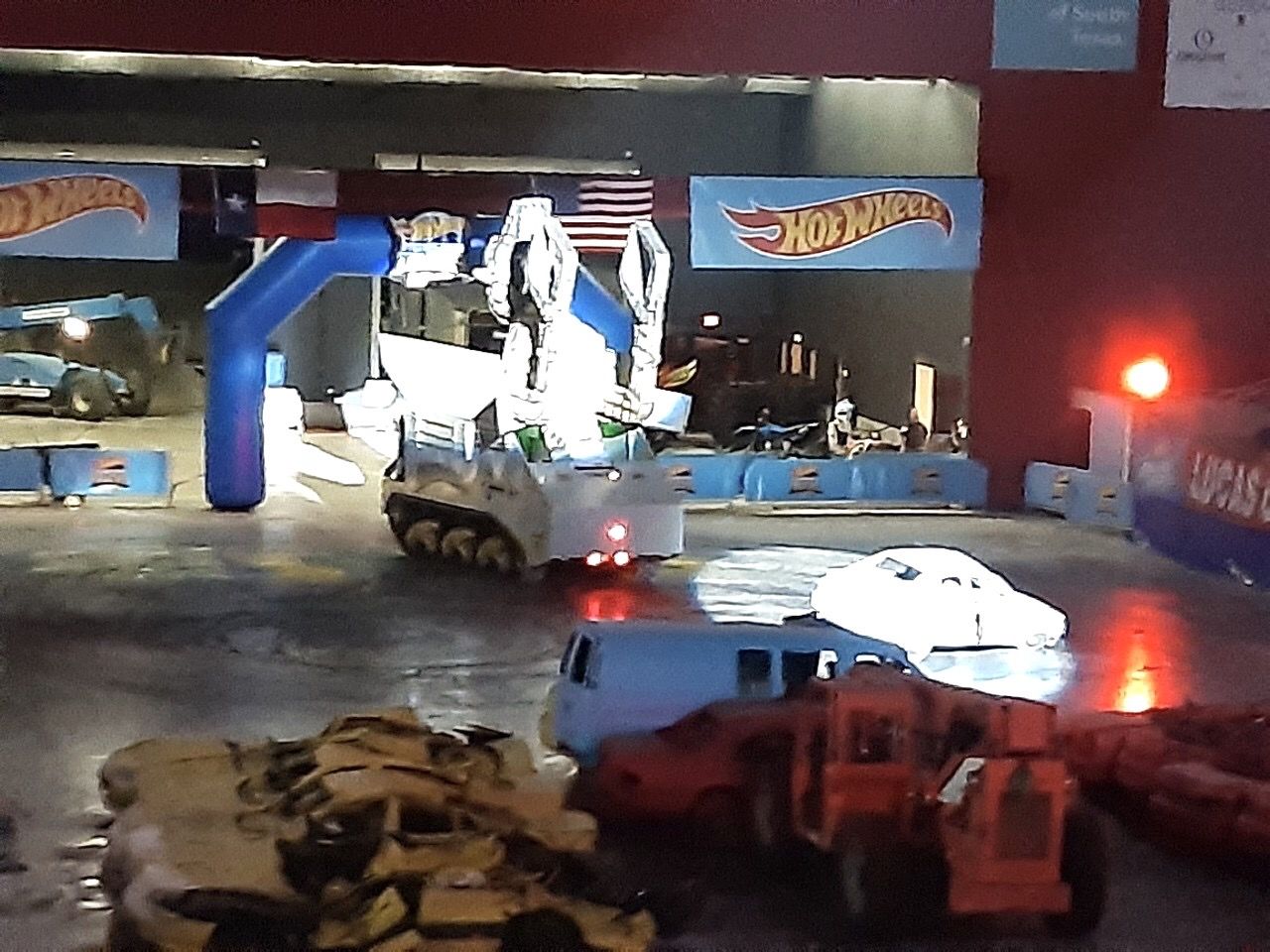 前回の話で最後に投入された青い車、ジャンプからの踏みつぶしとかトラック同士の間に置かれて潰されたりとかするのかなと思いきや(ここから写真がとても見づらくなってます、すみません;;)