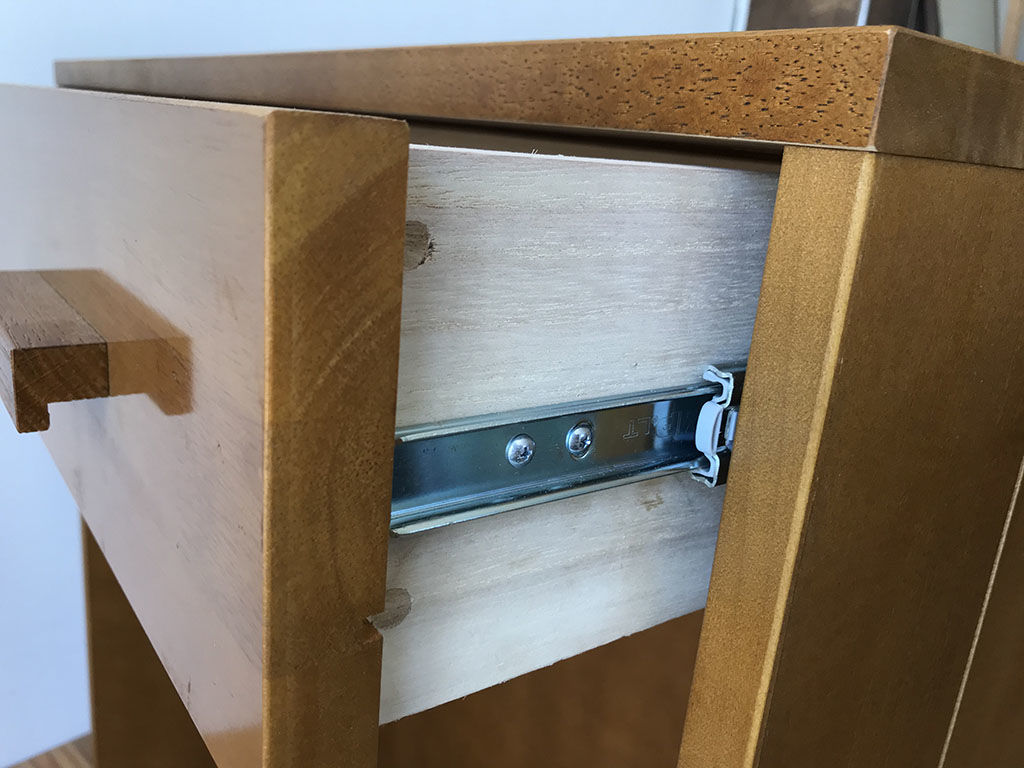 側付けタイプにもさらに2段式、3段式といって、引き出しが途中までしか引き出せないタイプと全部引き出せるタイプとあるのですが、それについてはまたの機会に。