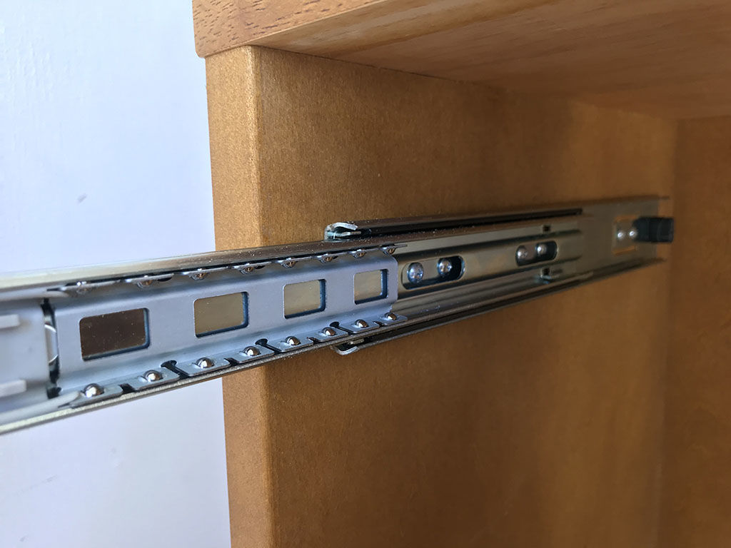 さて、側付けタイプのスライドレールが取り付けられている引き出し、引っ張り出すとこんな感じに本体側に付いているスライドレールが伸びてきます。
