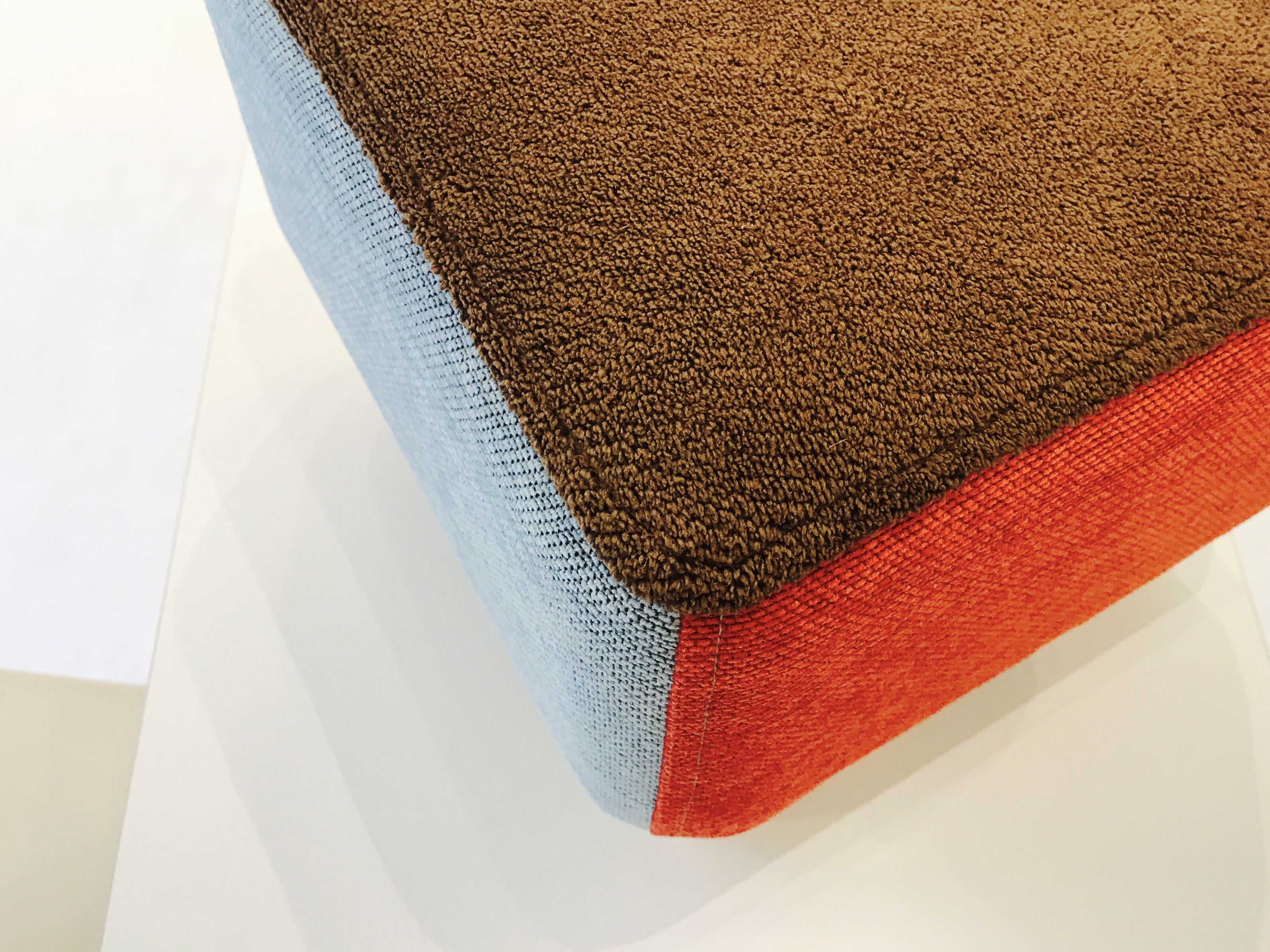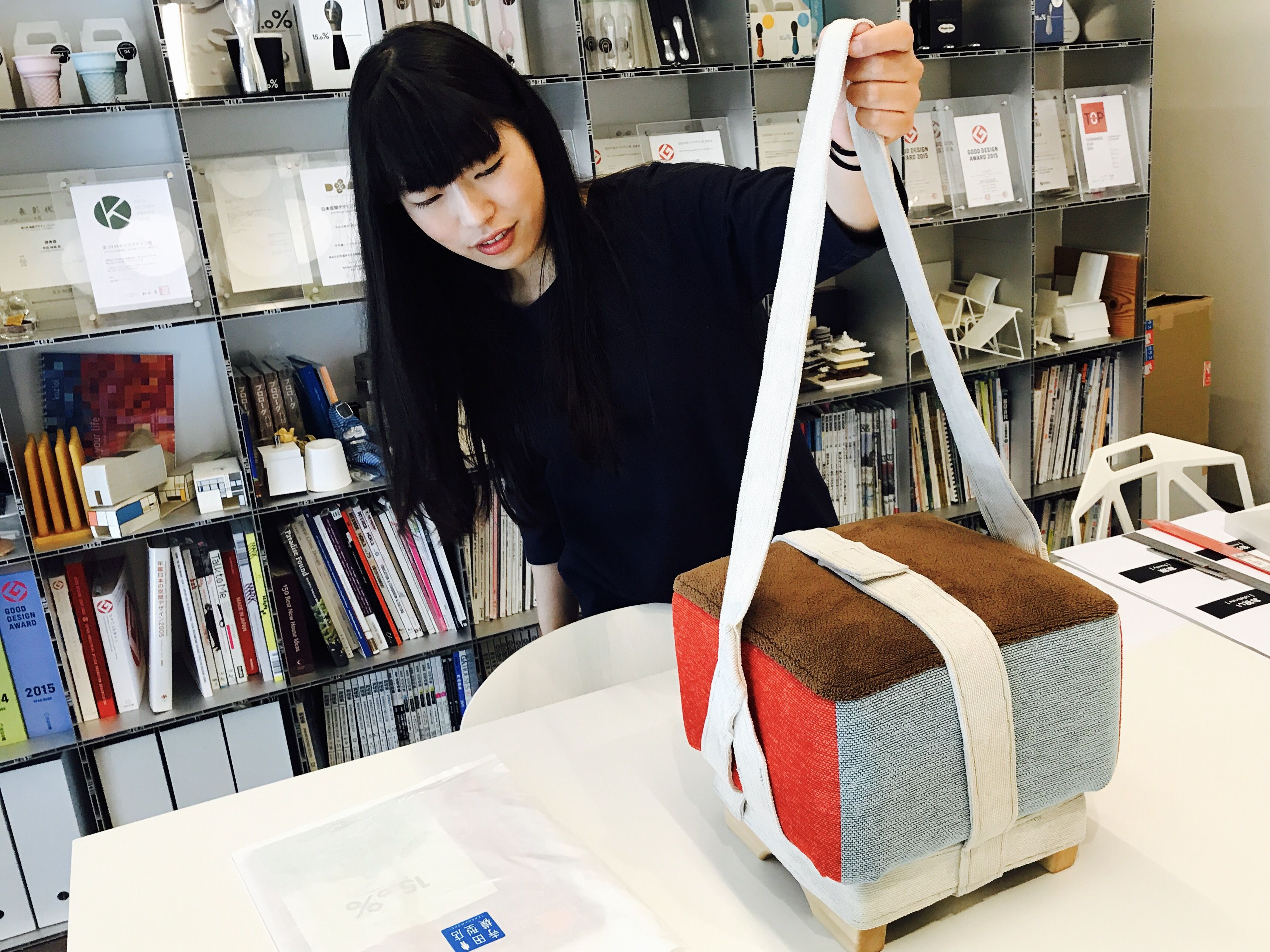 「超低座スツールのモンペスツールです。」と紹介した後に、さっそく触ったり座ったりしていただきました!ギュッギュッと手でクッション性を確かめたり実際に腰をおろしたりしながら、感想をいただきました。