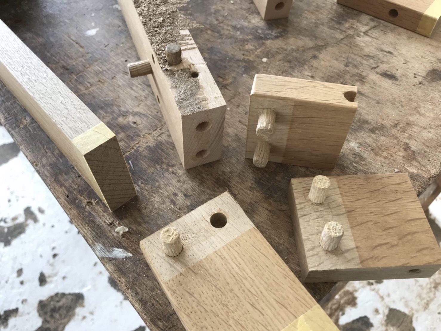 (こちらは、他の家具を工房で分解した時の写真ですが、ダボはこんな感じです。)