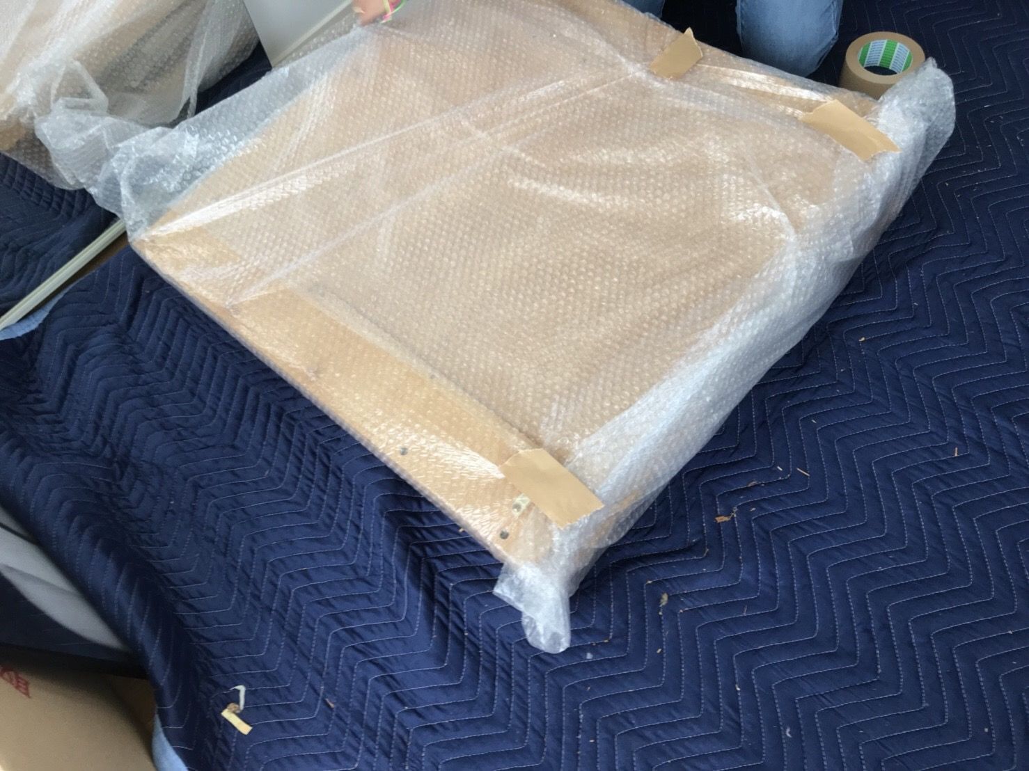 かなり大きくてそのまま運び出すとお部屋を傷つけかねないし、リメイク作業では最終的に工房で分解するので、お客さまのお家でその場で分解して搬出することにしました。