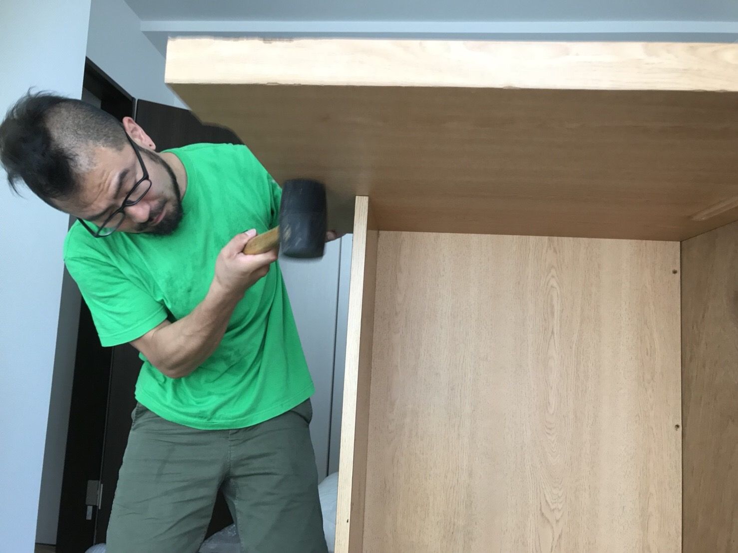 一度に力任せに外そうとしないで少しずつ全体を叩いていくと、見た目には分からなくても、中でダボとダボ穴がボンドで止まっている部分が緩んできます。根気よく全体に力をかけてやると、接着が外れ少しだけ隙間ができます。