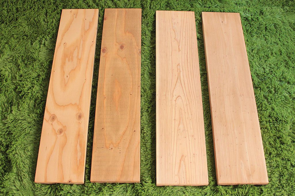 (左から針葉樹合板のナチュラル、ダークウォールナット、無垢杉材のナチュラル、ダークウォールナット)