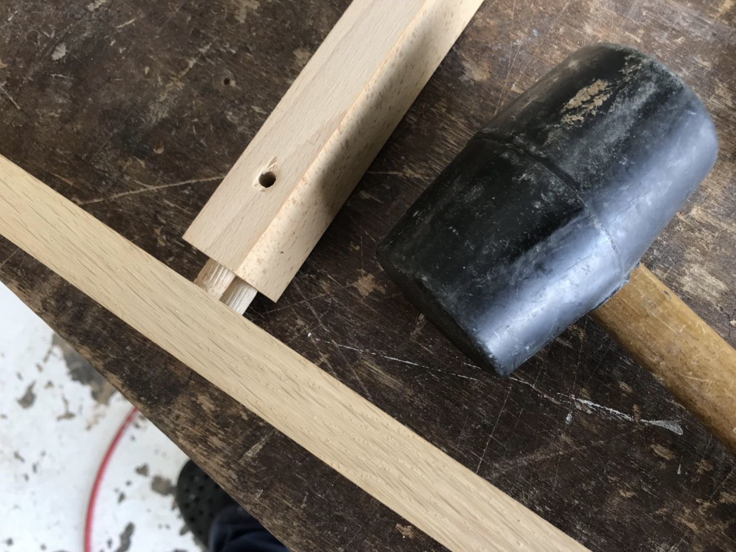 ホームセンターなどでも、小さな円柱状のダボが売られています。ダボがハマる穴を両パーツにあけ、ピッタリとハマるようにゴムハンマーで組みます。