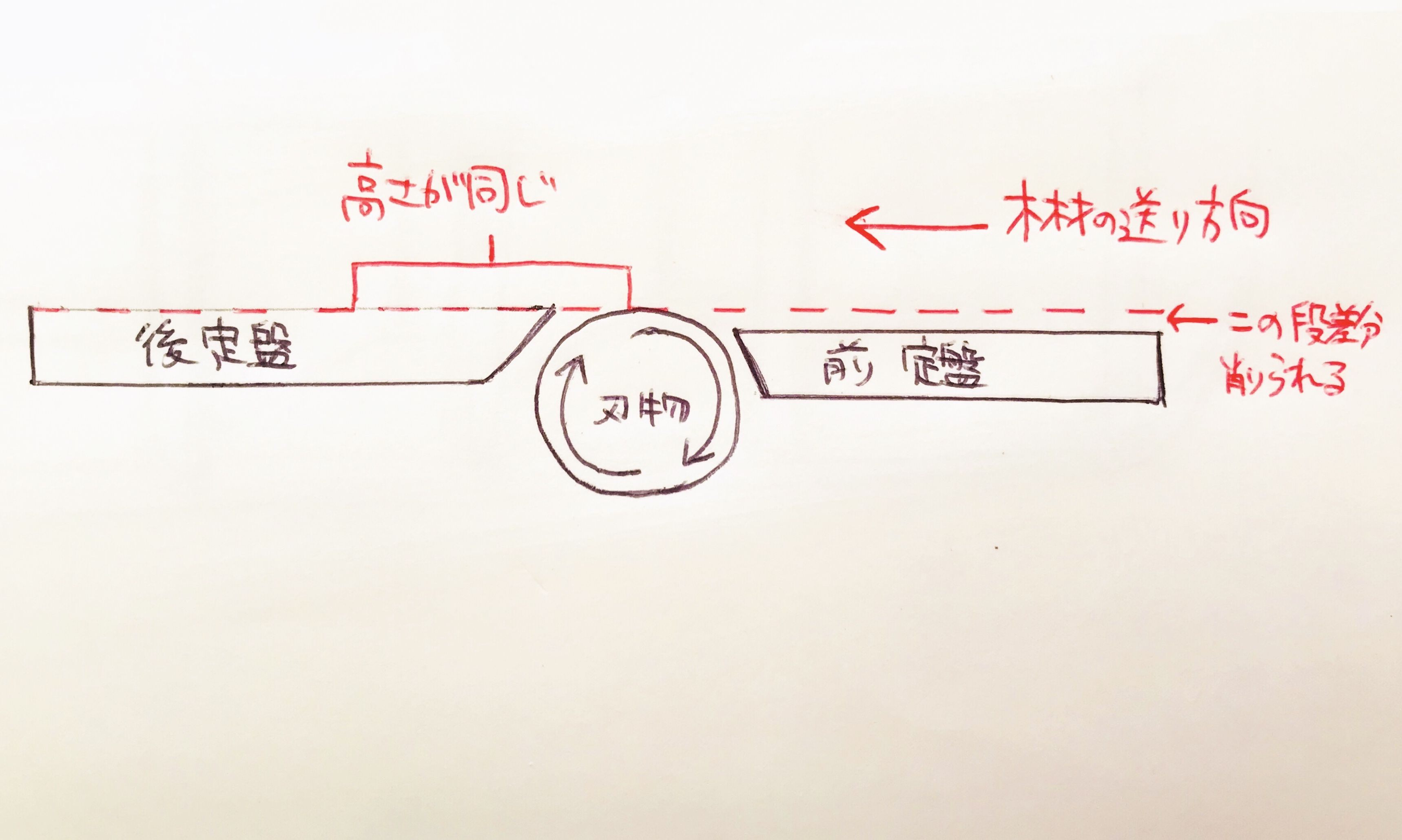 ↓の図のように、高速に回転する刃がついた微妙に段差のある定盤の上を木材を押し進めることにより、木材が平面に削れます。また、平面になった面を定盤と垂直になっている定規に押し当てながら他の面を削ることによって直角を出すことができます。