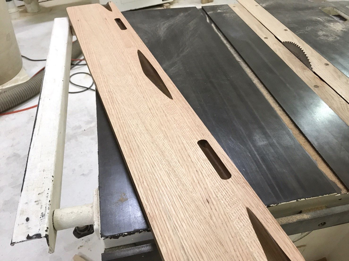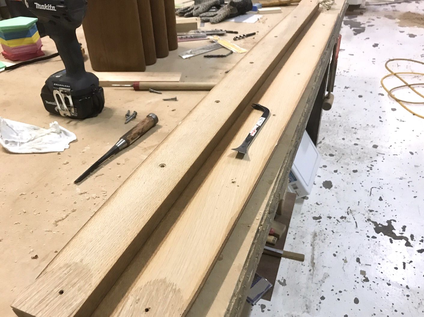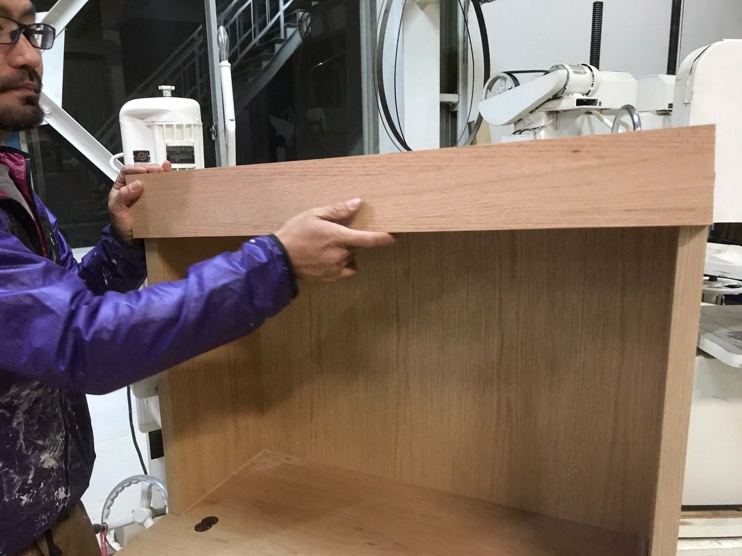 プレナーはすでに平面になっている板に鉋をかける機械なので、板が反っていたり歪んでいたり、元の家具のデザインで曲面の加工などがされている場合は、まず基準となる平面を手加工で作り出さなくてはならないのです。