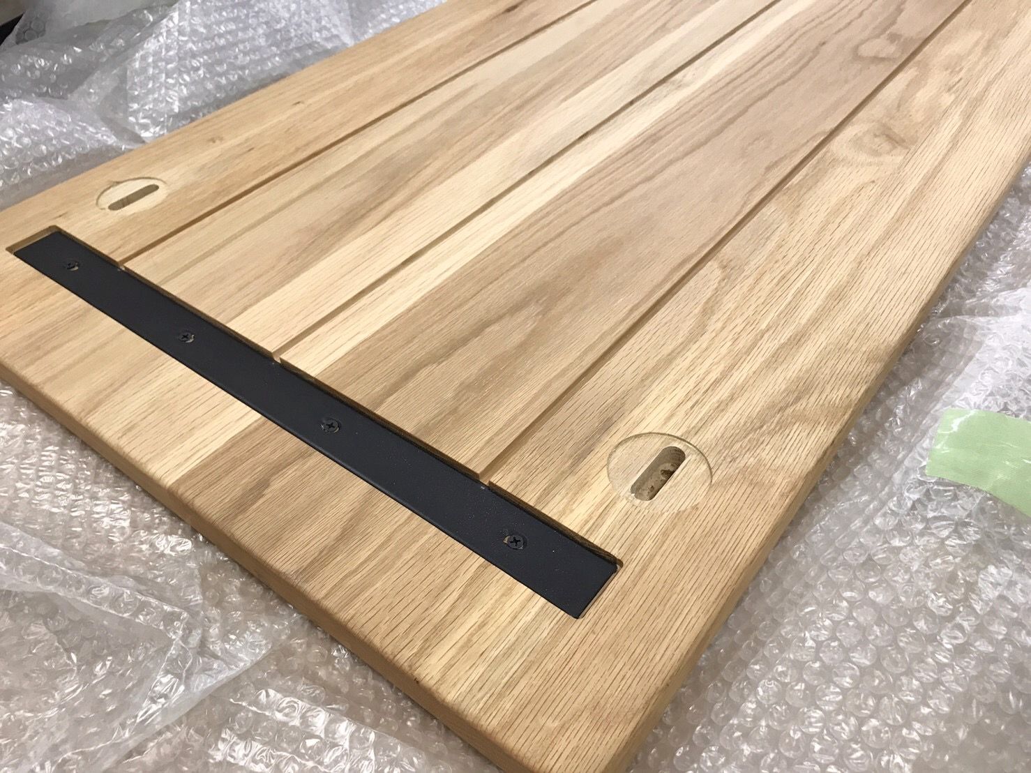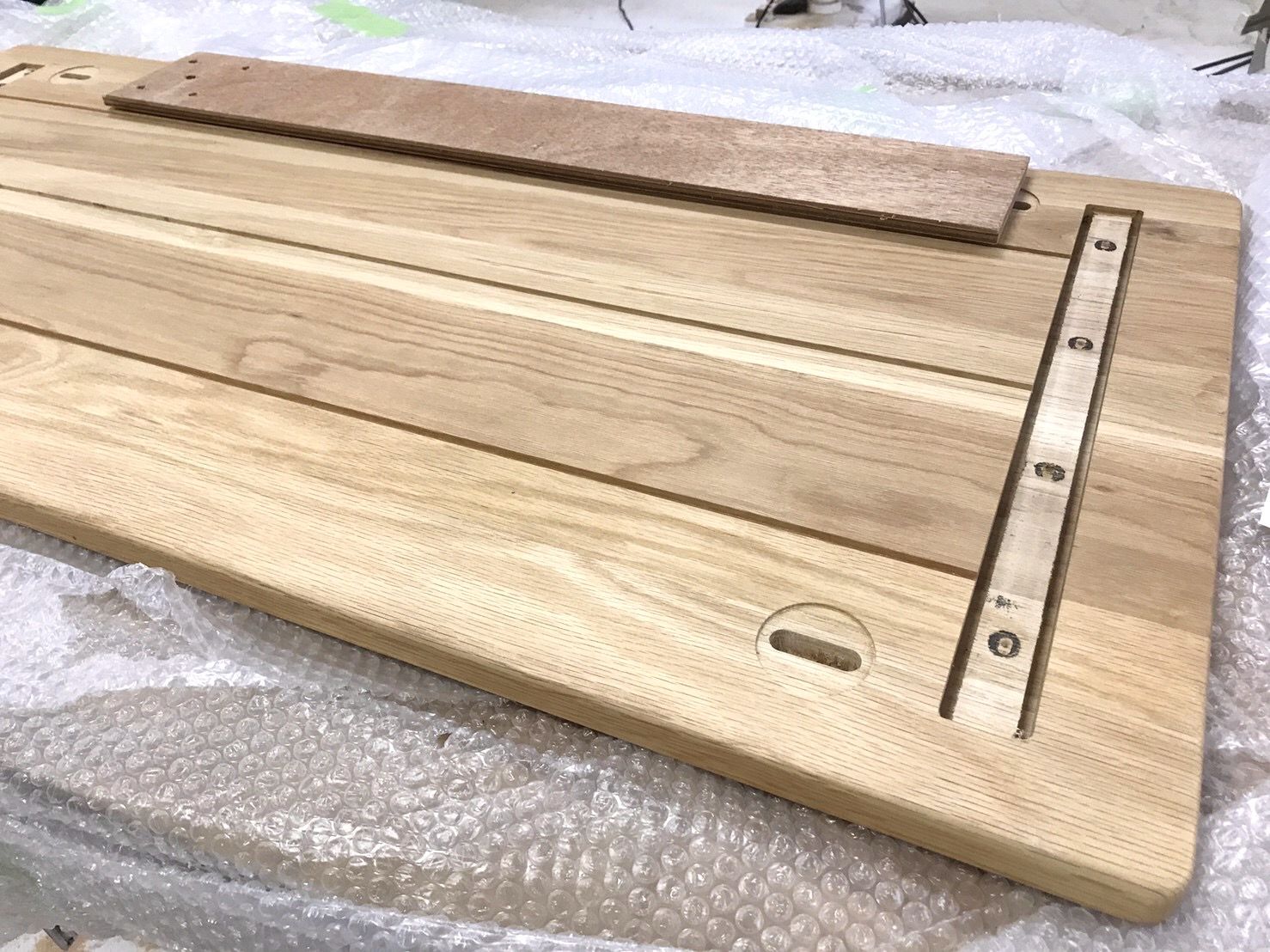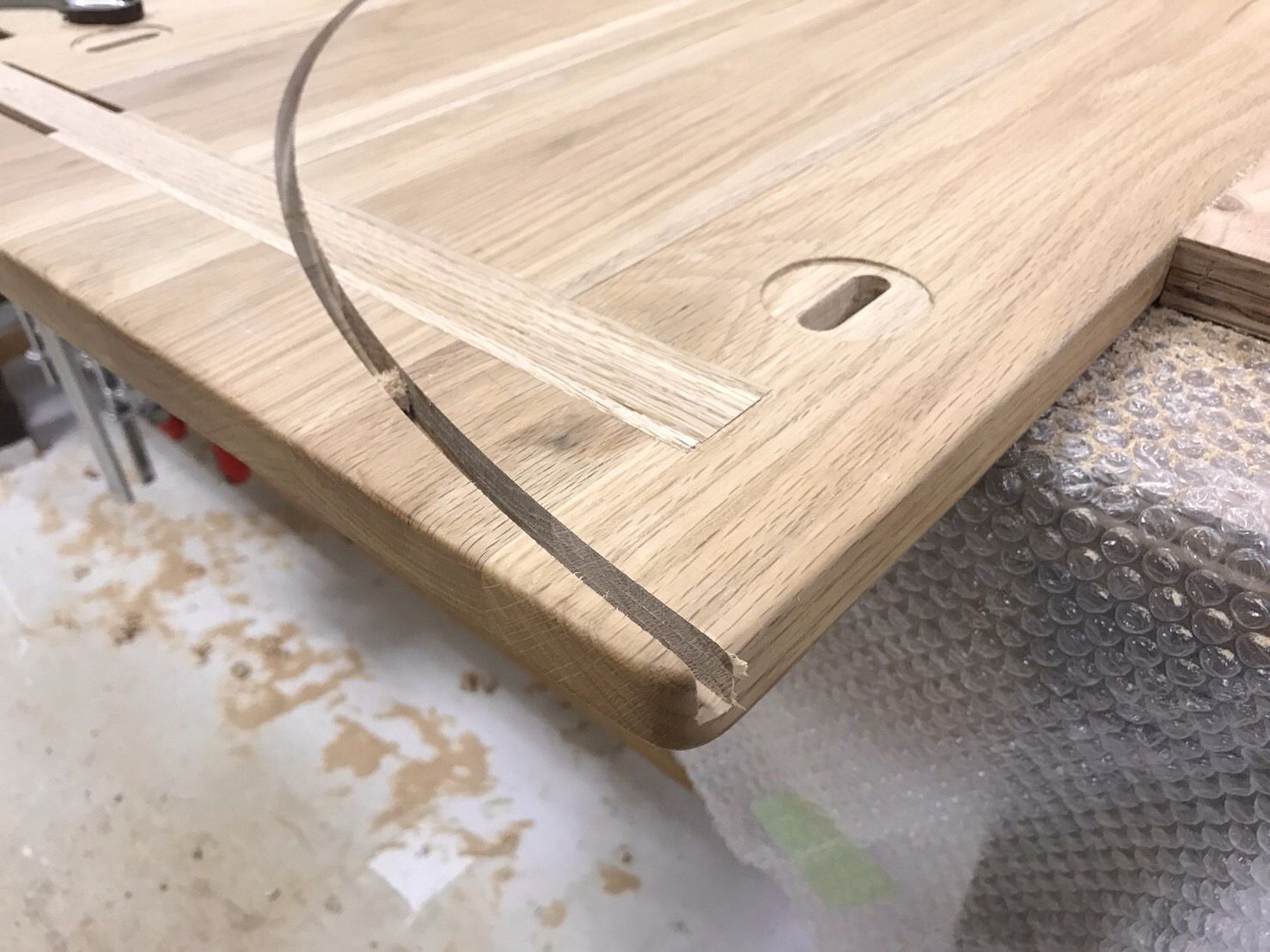 そのため、反り止めの跡を綺麗にくり抜き、テーブルと同じオーク材で埋めることにしました。