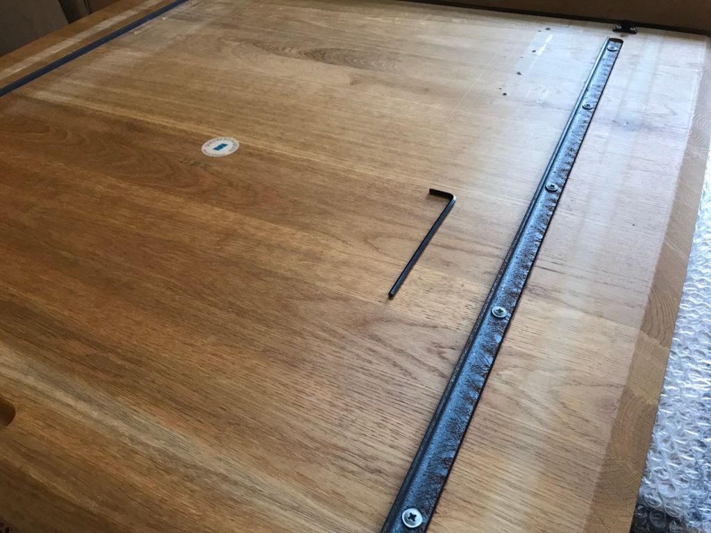 この金具は天板の反り防止の役割と、エクステンションテーブルなのでスライドレールの役割もしていたそうです。