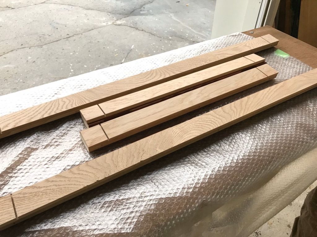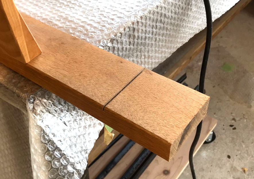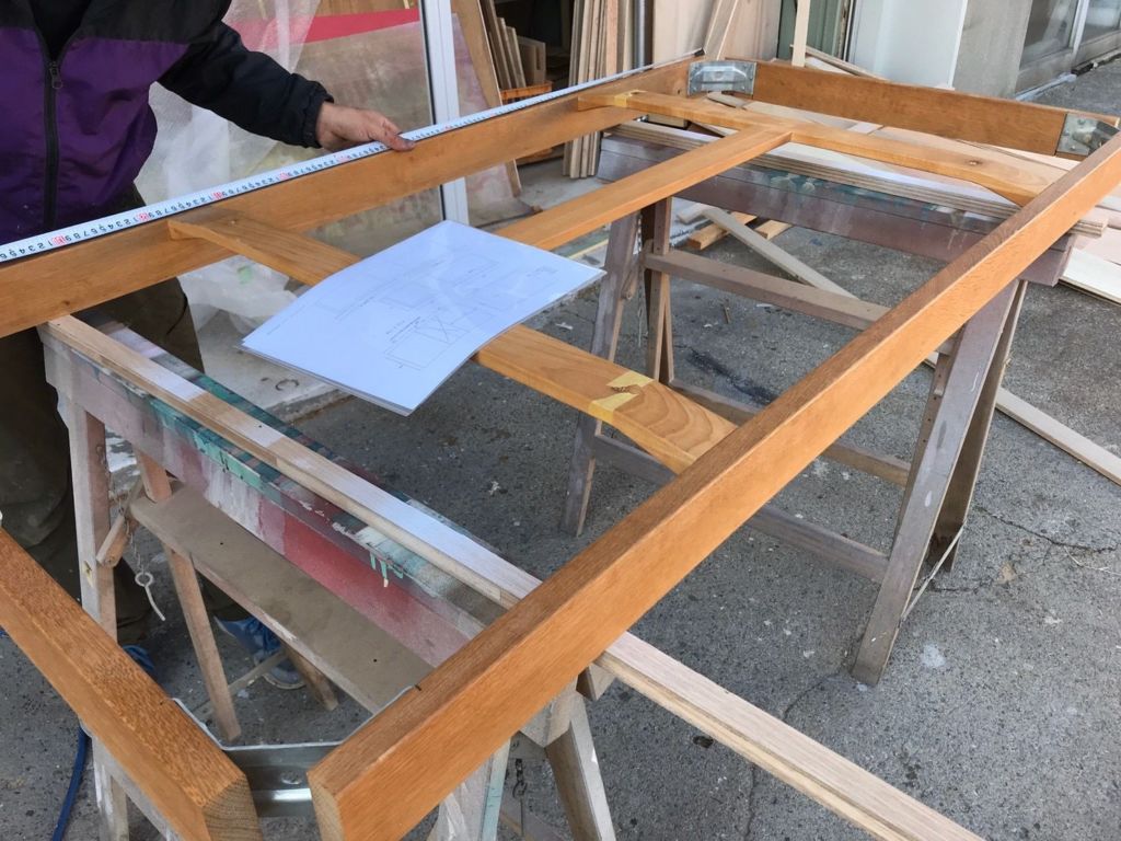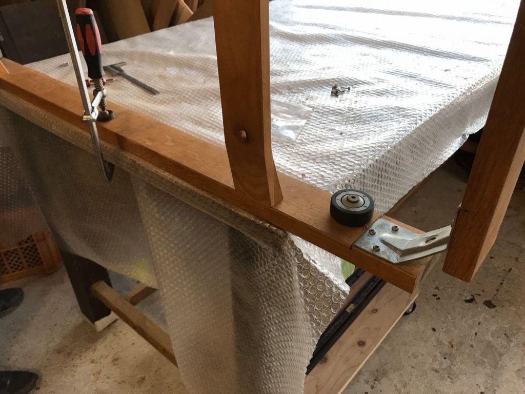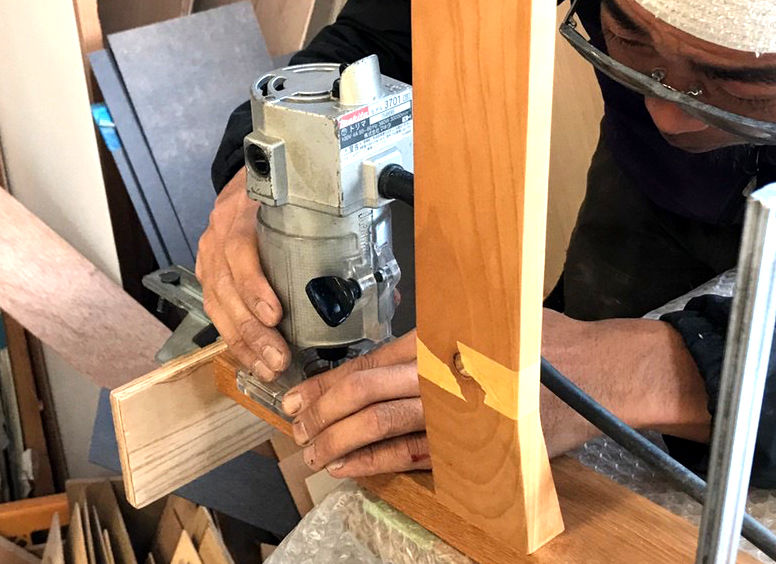 簡単に説明すれば長さをカットして再度組み立てるという流れなんですが、フレームの四隅にはコーナー金具が使われており、長さをカットしてしまうとその金具を差し込んでいた溝も無くなってしまいます。なので再度トリマーという工具で金具用の溝を彫っていきます!