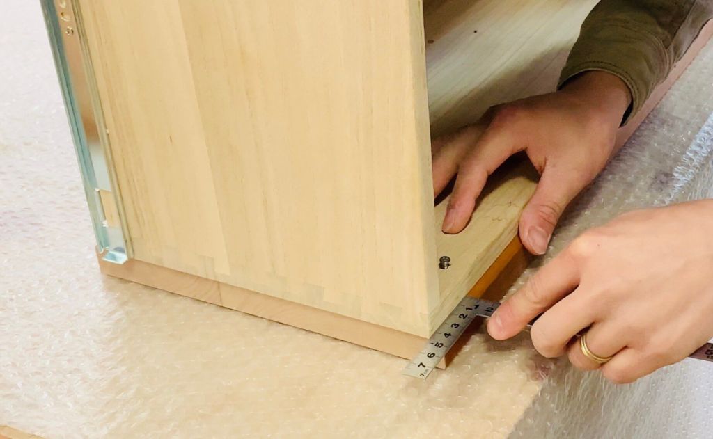 なぜなら少しでも左右の位置がズレると、引き出しを収納したときに本体と前板の間に生じるわずかな隙間(クリアランス)が左右それぞれで変わってきてしまい、見た目がよくなくなってしまうから。