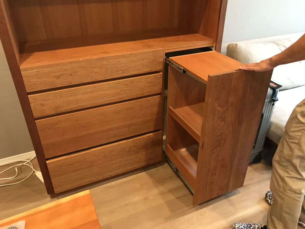 ということで、まず4段引出し部分とスライド棚部分を分解していきます。