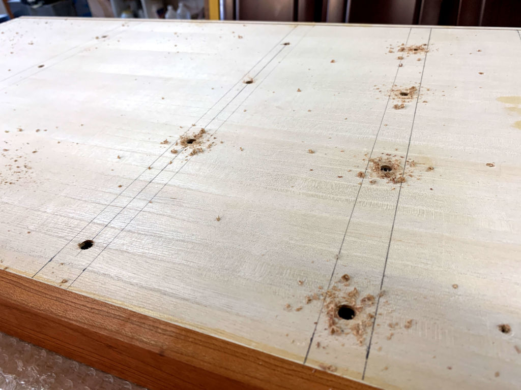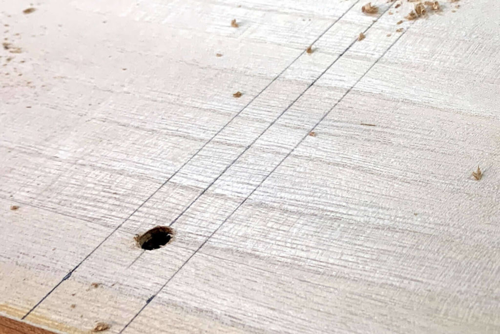このダボは元々の家具に埋められていたもので分解したことにより姿を見せたんですが、ここに板を接着するには接着する板の方にダボ穴を開けなければいけません。