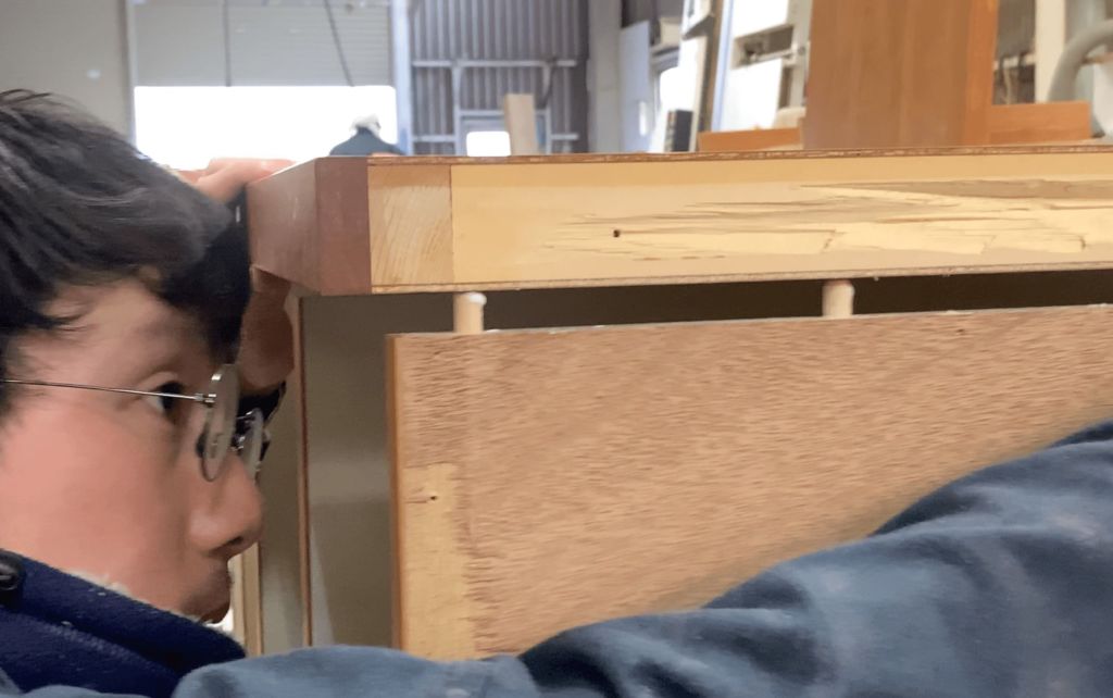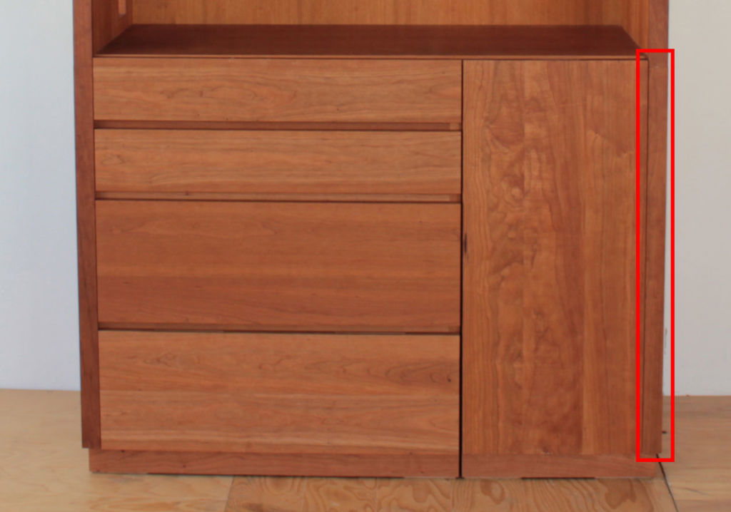 「出来るだけ元の材料を使って製作して欲しい」とお客様の希望があったので、先程分解した、引き出し右横のスライド棚の側板を使用して製作しているんです。