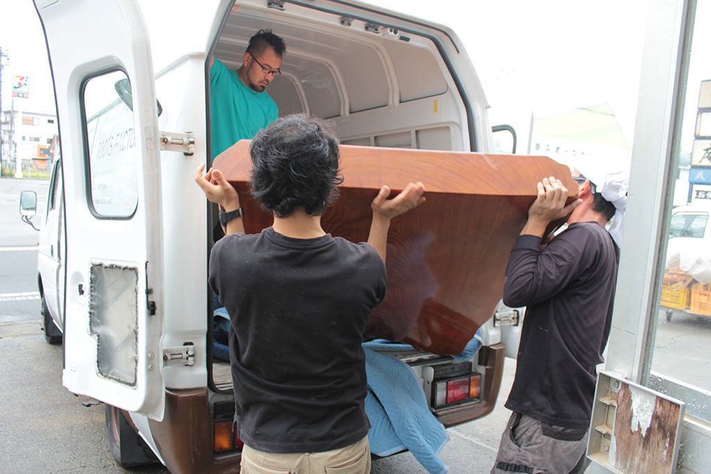 家具のリメイクをご依頼いただいたお客様の家具のお引き取りは自社トラックでお伺いしているため、そのトラックが工房に戻ってくれば家具を工房に運び込む作業もします。