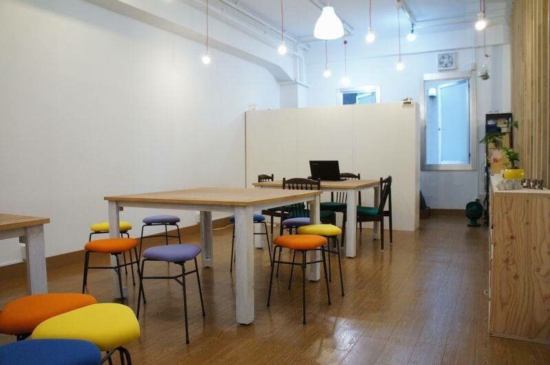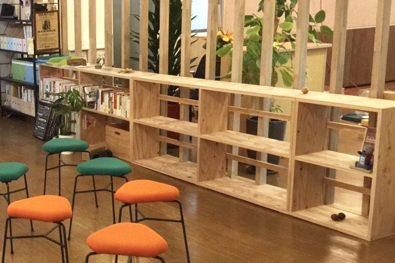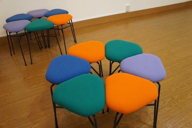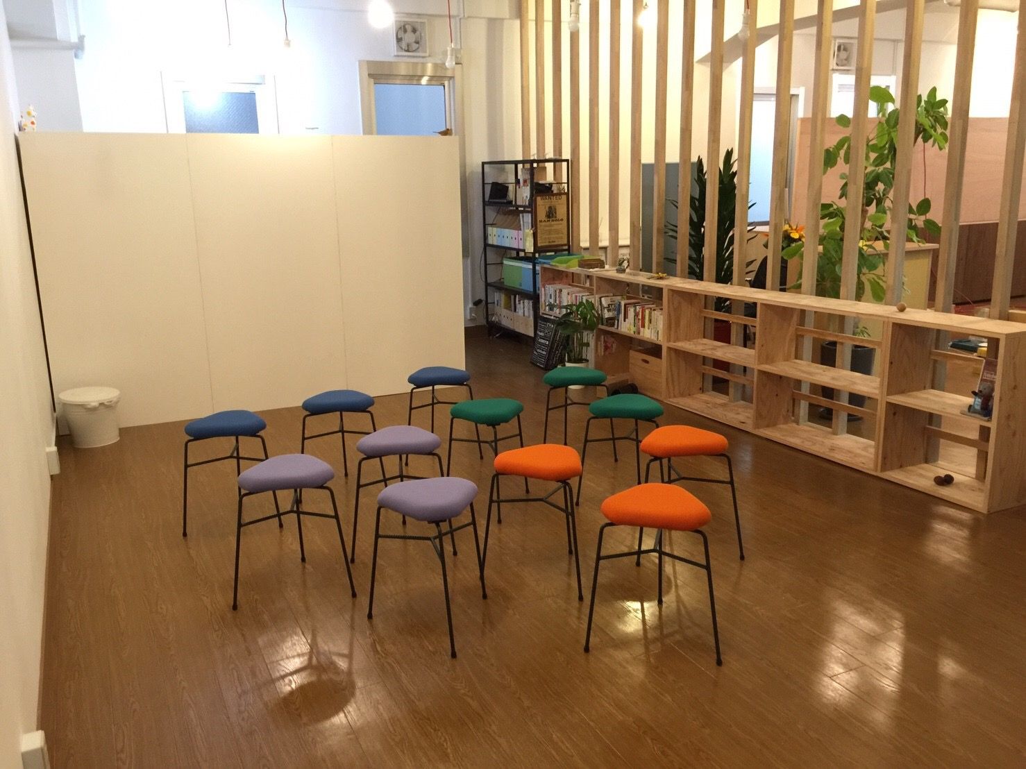 「ありのままでいいんだ」と肌で感じる不思議な場「session STUDIO」さん。白い壁にカラフルなスツール、素朴で親しみやすいデスクや棚が置かれた、とても明るい空間です。
