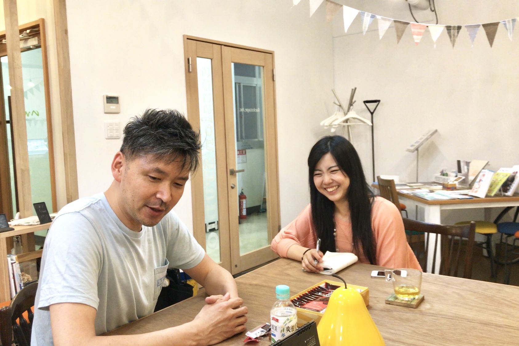 「改めまして、ルーツファクトリーの山本と申します!今日は、ルーツファクトリーの家具をお客さまがどのように使われているのか、というのを見たくてお邪魔しました!よろしくお願いします!」