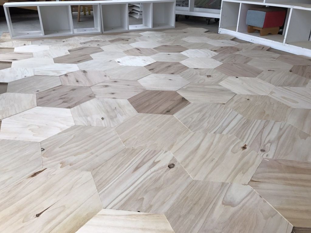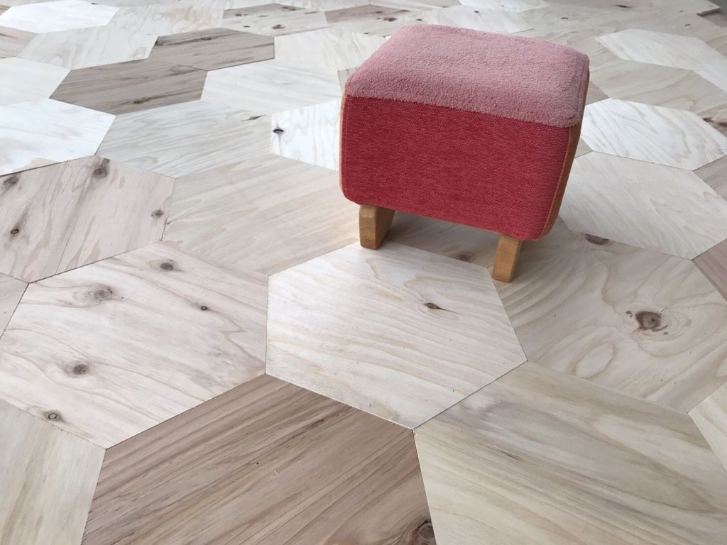 「タニヨンベースそのものをルーツファクトリーの作品として見てもらおう!」と。そのひとつがこの六角形のウッドタイル、木製の六角形の床材です。