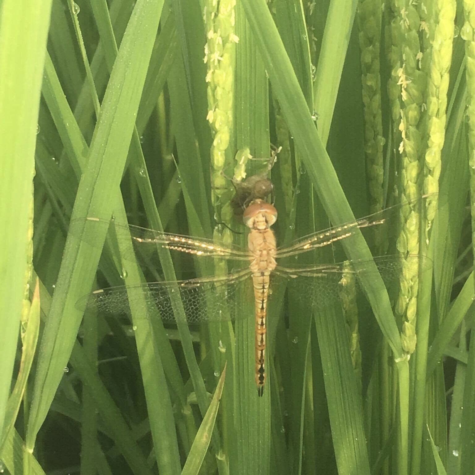 そうして無農薬、無化学肥料でできた稲なので、トンボたちも集まってきます。これは羽化している様子(^^)素敵な写真ですね~!