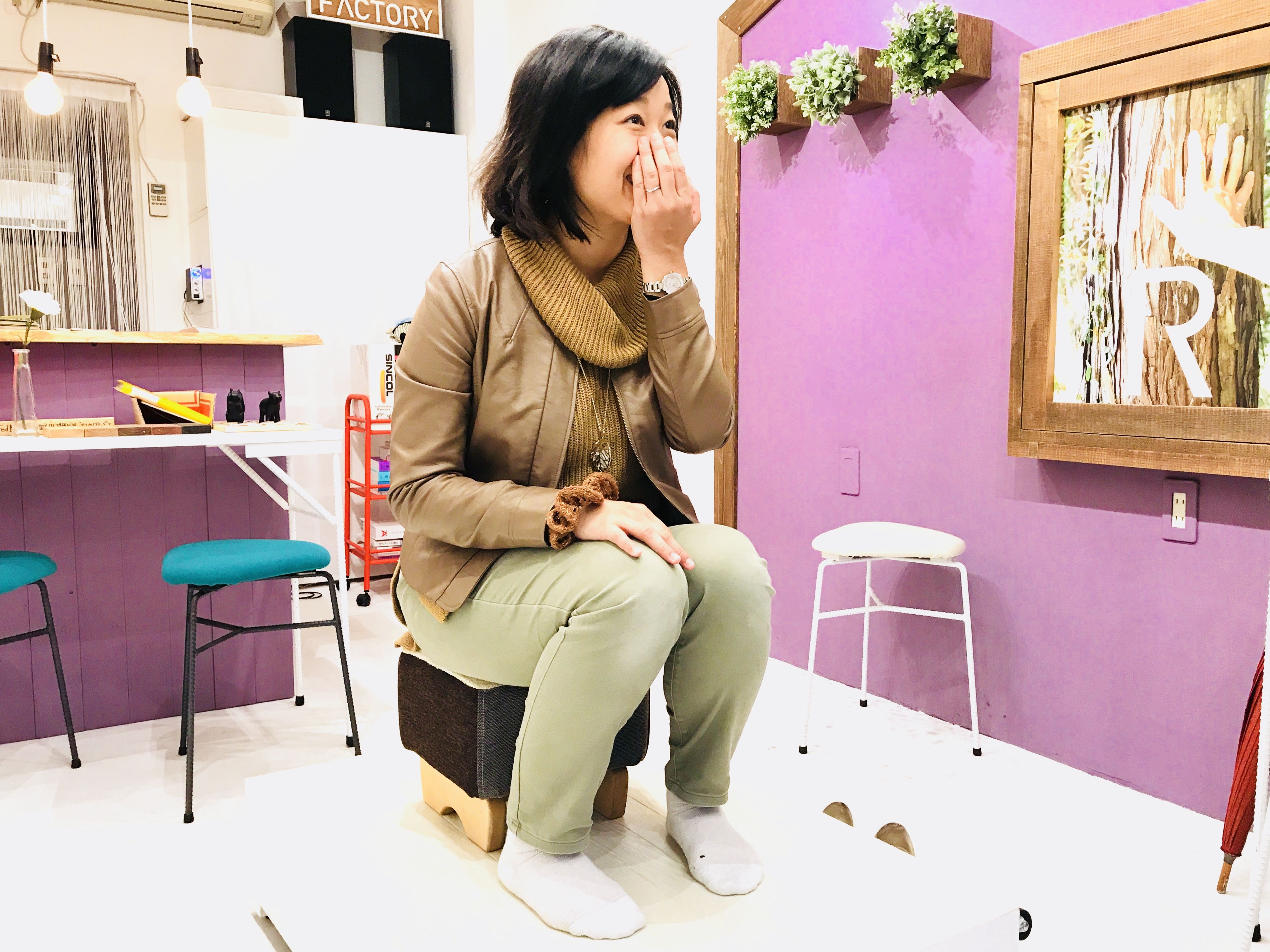モンペスツールに座って「あっ」と笑顔を見せてくださるお客さま、