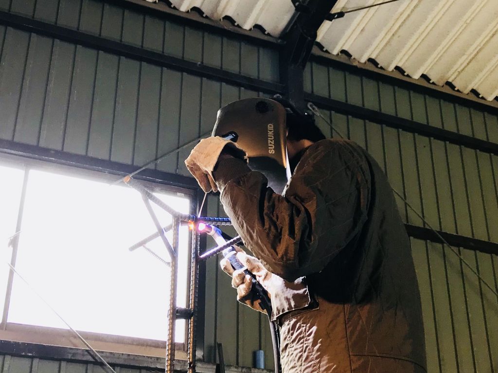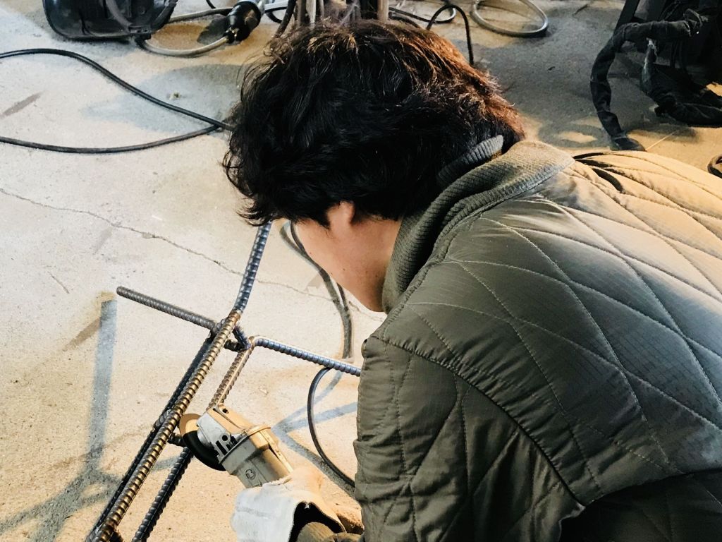 まだ未発表のルーツファクトリー家具のアイアン部分を溶接をする石川工房長。
