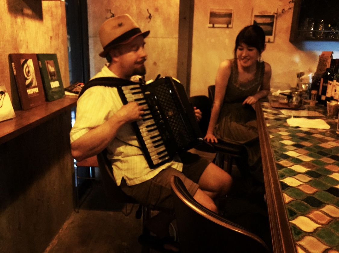 この日はアコーディオン奏者という方がいらっしゃってたんですけど、チナツさんたちとお話ししているうちに「楽器持って来ちゃおうか〜♪」ということになり、なんと、その場で生演奏が始まりました!!