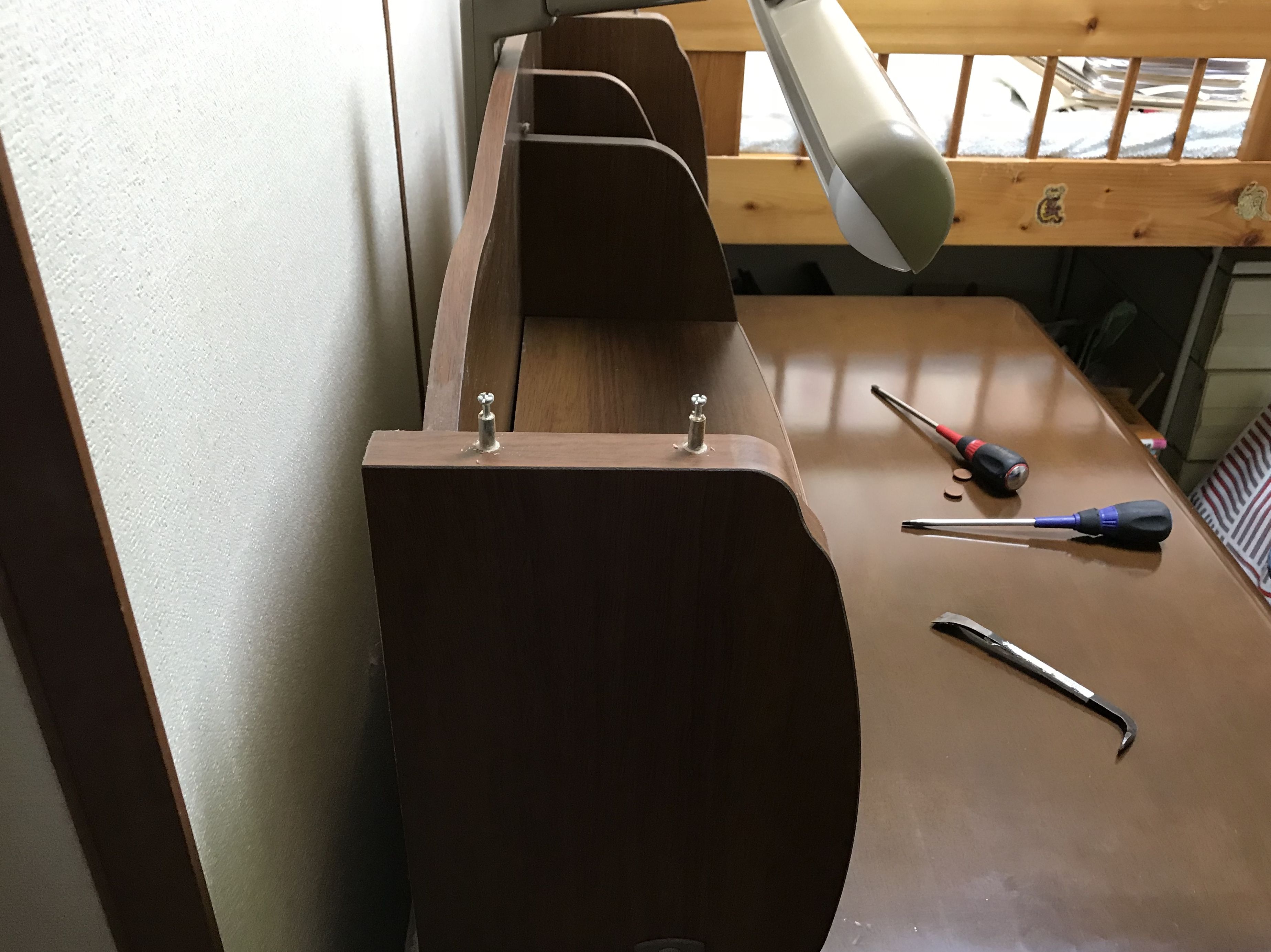 そう、一口に学習机といってもその組み立て方法は様々。以前リメイクさせていただいたくろがね工作所さんの学習机では、インパクトでビスを外したりゴムハンマーで叩いたりして分解していきましたが、今回はプラスドライバーとマイナスドライバーのみで分解作業が進みました。