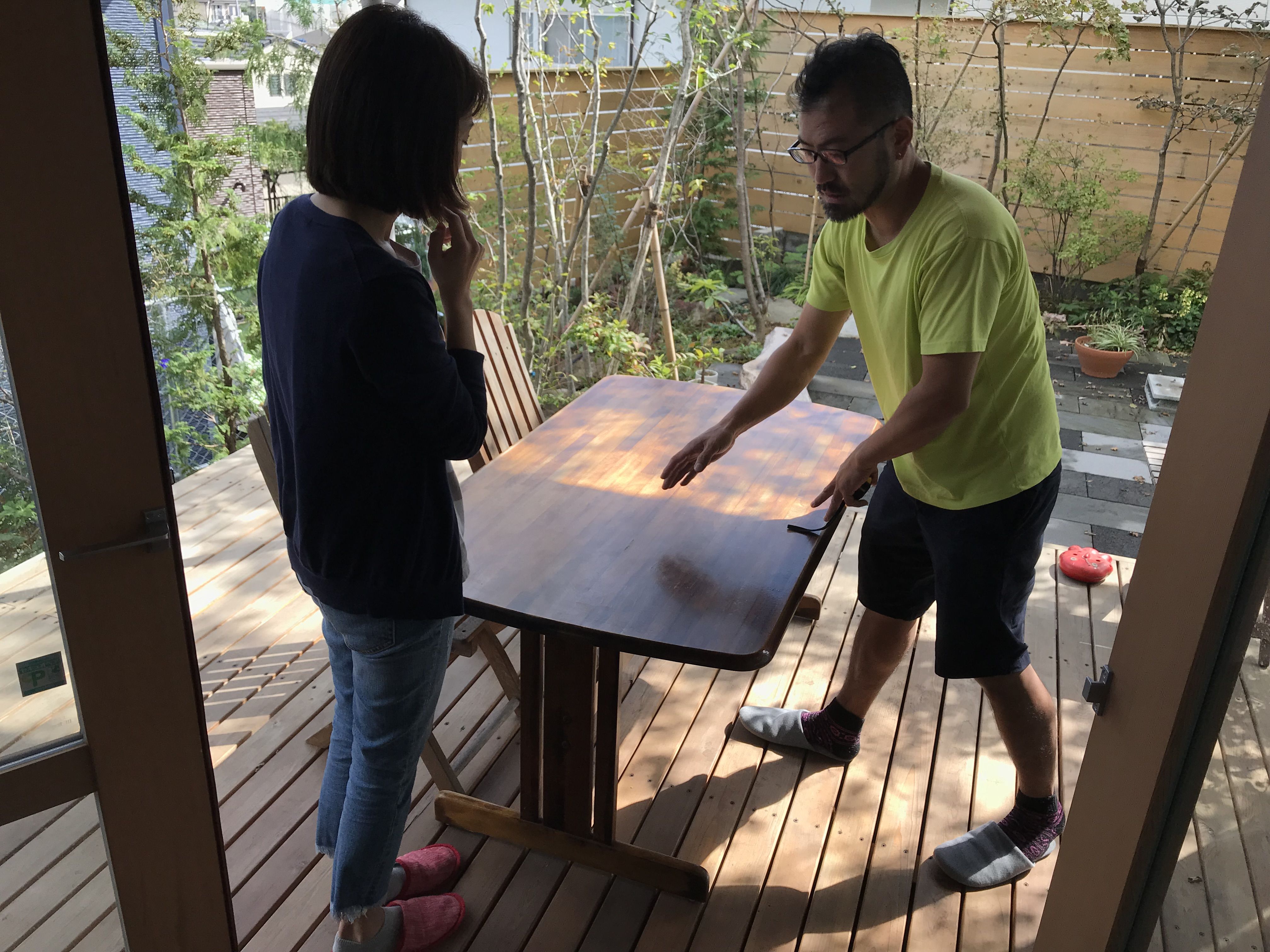 リメイクについては、「このテーブルの良さを活かしたいけれど、昭和なデザインが気になる。」というのが、旦那様と奥様お二人のご意見のようでした。ただ、お二人のインテリアの好みが少しずつ違うから、どうしたものかなぁ、いうのもお悩みのようで・・・