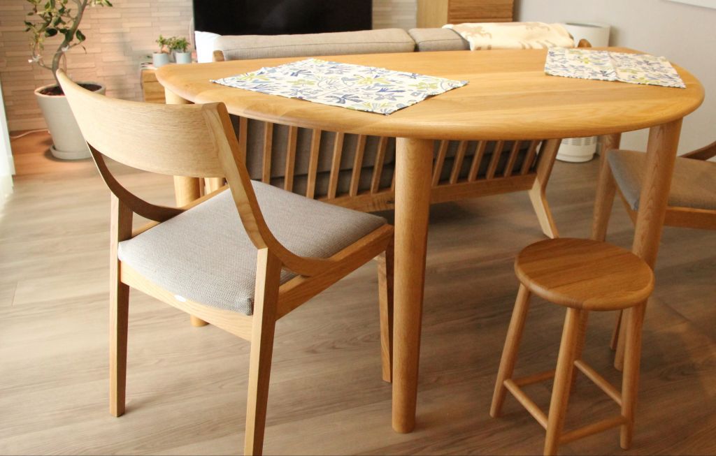 お問い合わせもご注文もかなりの数をいただいている半円テーブル。無垢オーク材でサイズや仕様にこだわった1台を製作させていただきました。