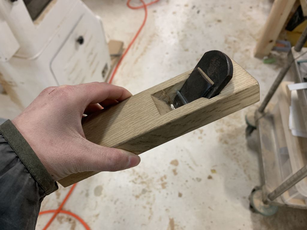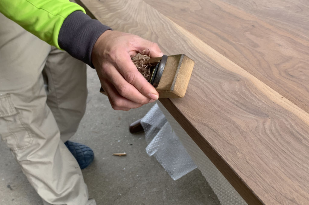 鉋(かんな)です!天板の上面、側面を当て終わったら角の部分を触っても痛くないよう、面取りをするのです。