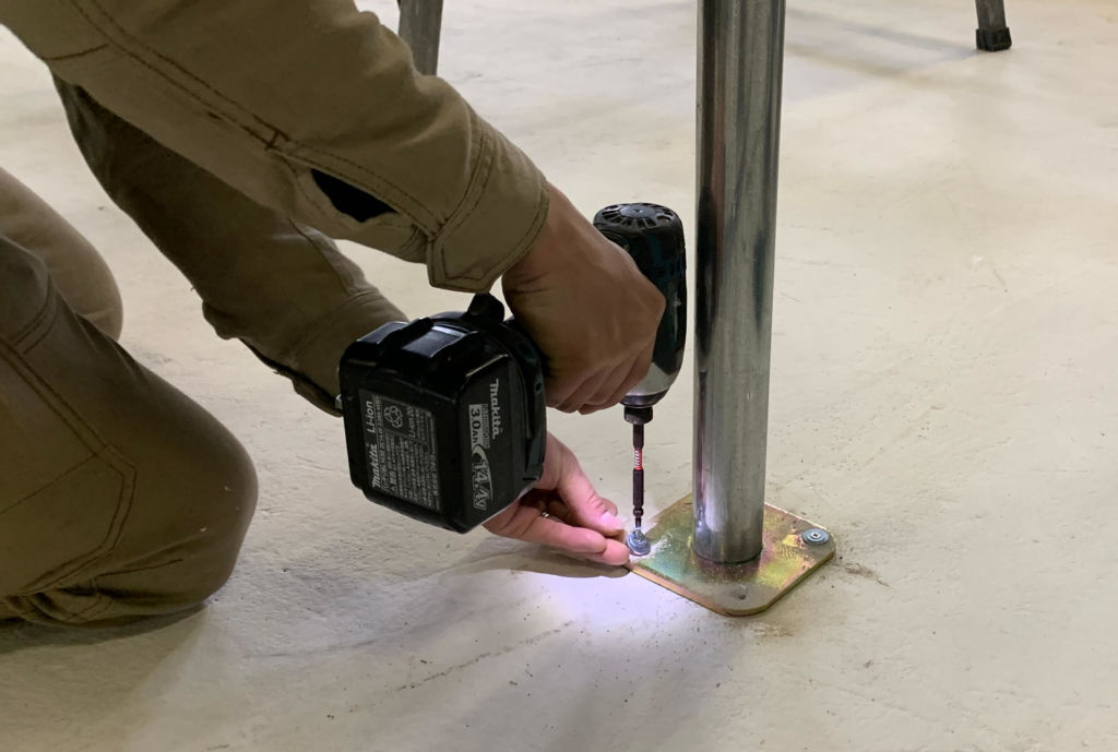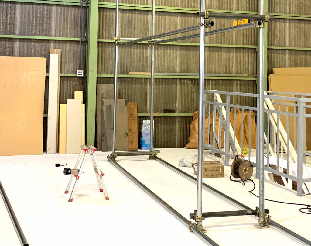 まずペンキを塗り終わって綺麗になった床に何やら続々と単管パイプが建てられていきます。パイプの長さ的に何かすごく巨大なモノが出来そうな、、、!!