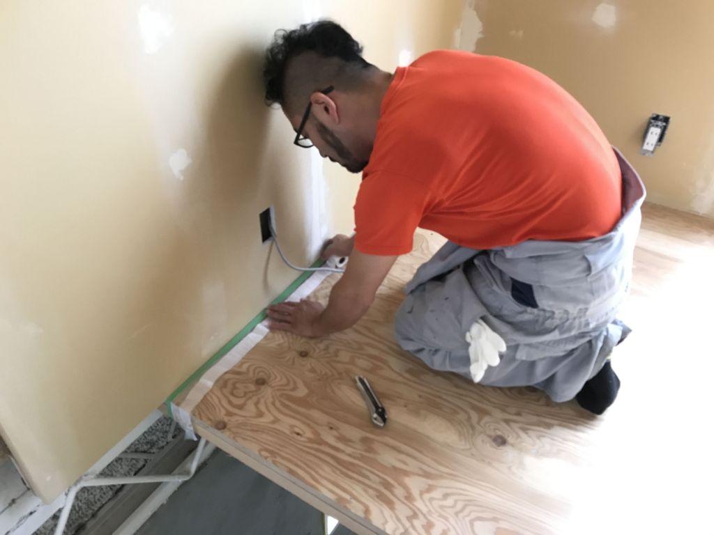 何事も下準備が大切ですね。特に塗装は下準備が大事です。2階の約50㎡(平米)を塗るのに、養生が1時間、ローラー塗装が2時間といった内訳でした。まだ湿っている部分があるのでムラに見えますが、乾くともっと綺麗になります。