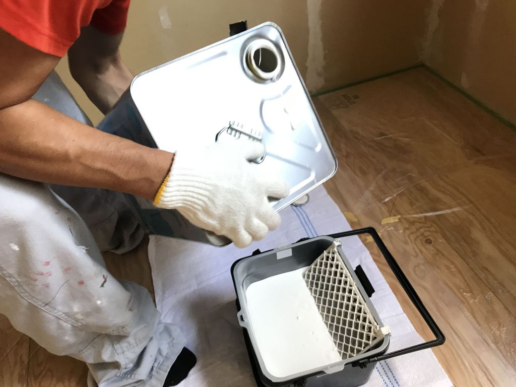 ペンキをローラー用の容器に入れます。この時、缶の口を上に向けるのがコツです。一見入れにくそうですが、こうすることで塗料が缶の口とか縁にドバッと着くのが避けられます。
