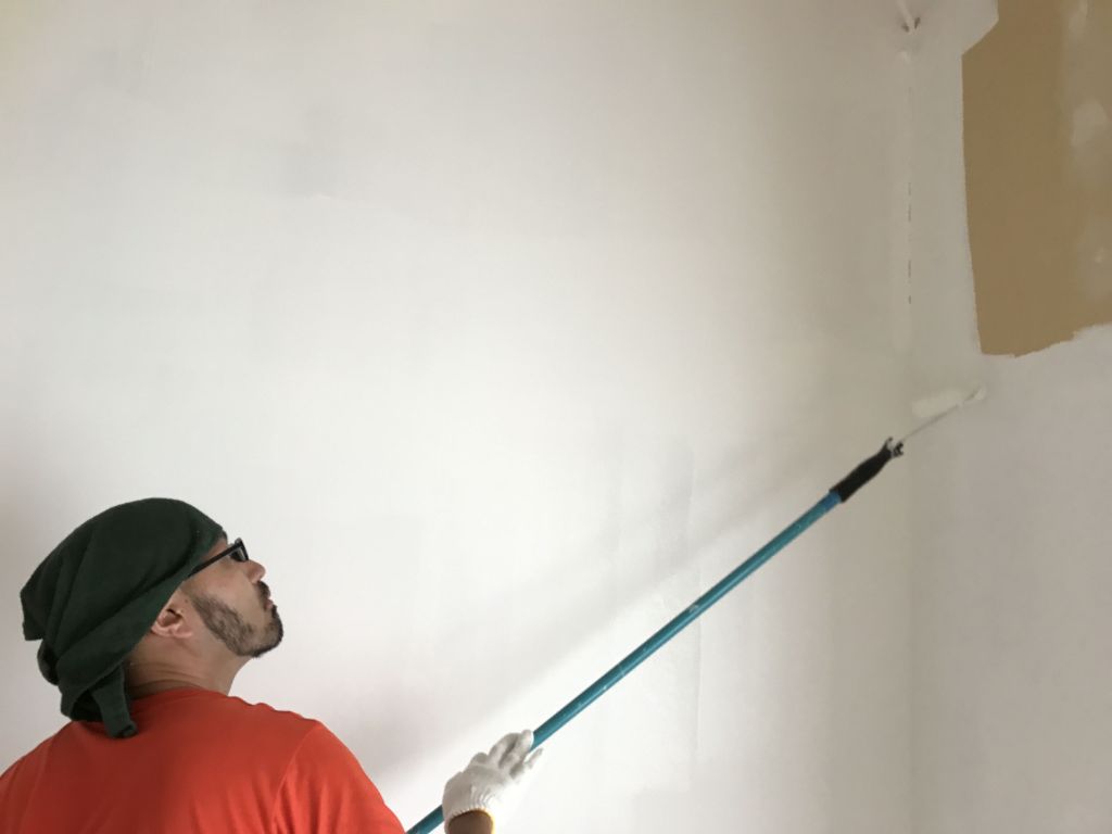 手の届かない高いところは延長の棒を使って塗ります。この棒はローラーと一緒にホームセンターで千円程で売っています。少し高いところを塗るのには脚立よりも断然オススメです。