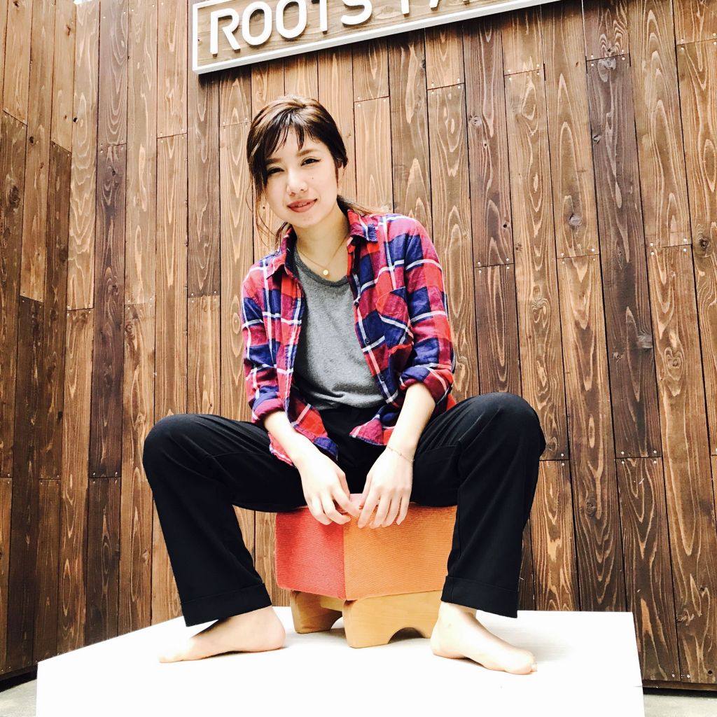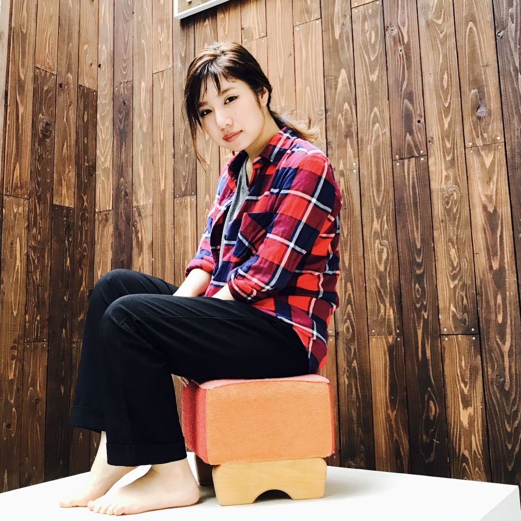 こちら、田淵沙希さん!女優を目指して数か月前に大阪から上京されたそうです!ルーツファクトリー東京店へのご来店は初めてだったのですが、モンペスツールを見て「かわいい!!」と言ってくださり、座っていただくことに♪