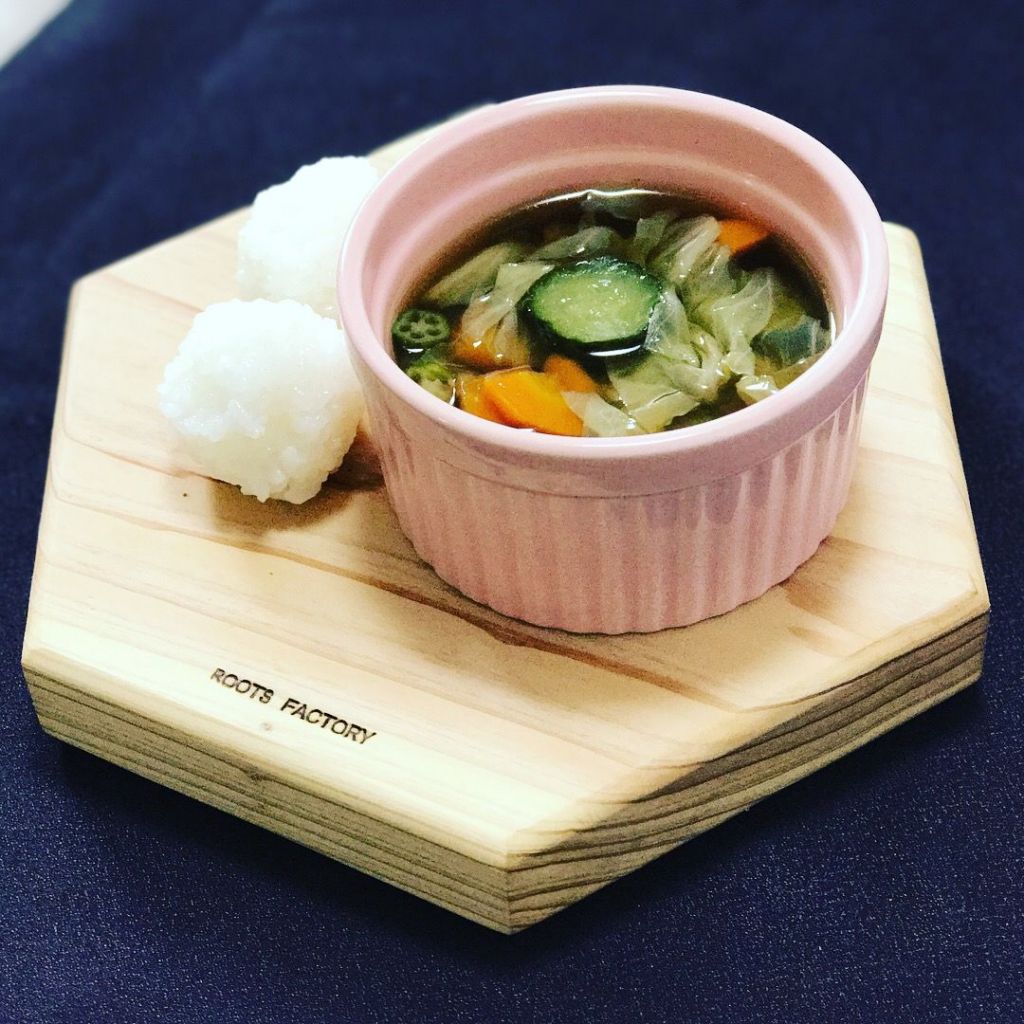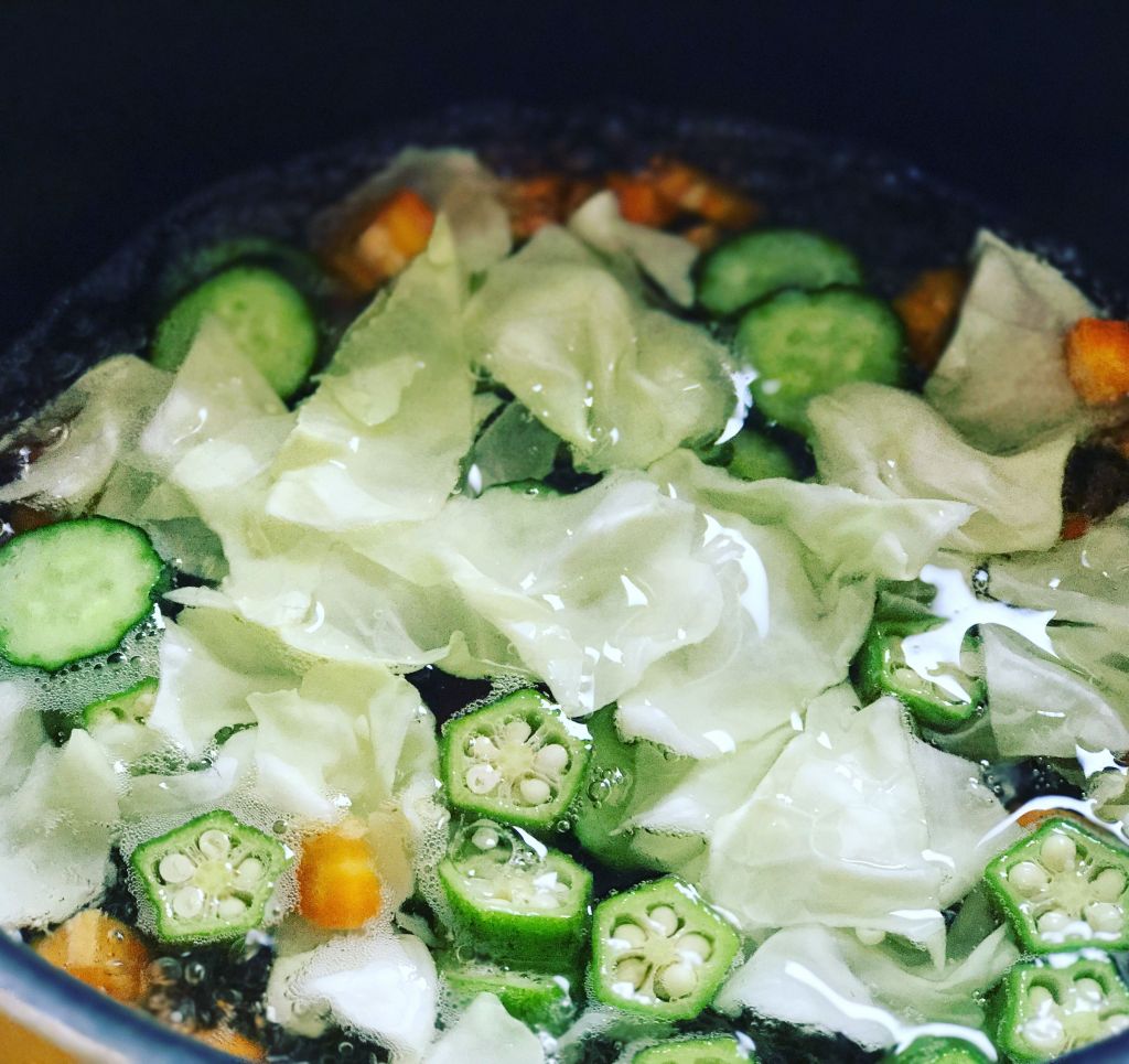 朝ごはんには具沢山スープ。ニンジン、オクラ、キャベツ、キュウリをじっくりと煮込みました。