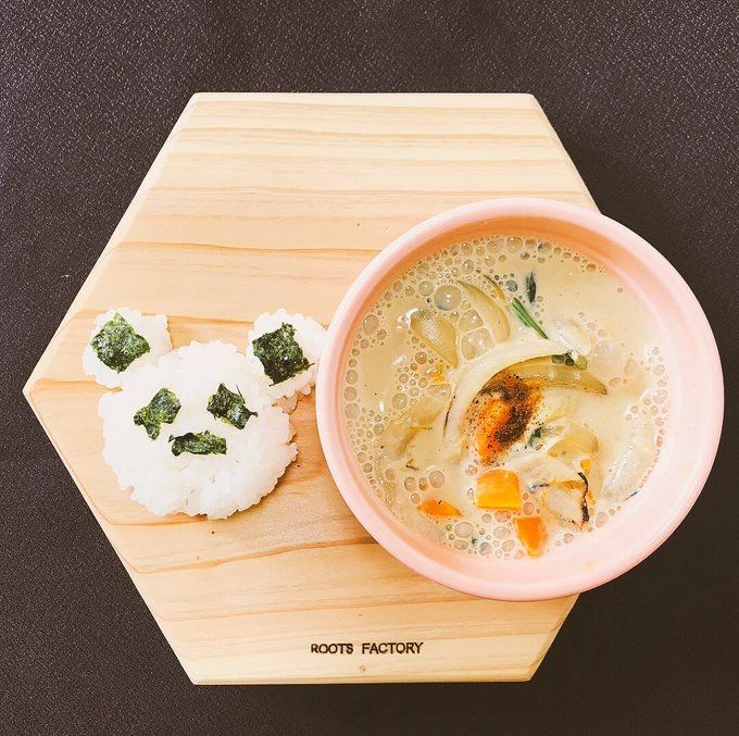 今朝テレビで繰り返し映っていた上野動物園の赤ちゃんパンダ「シャンシャン」が可愛くて可愛くて!思わず作りたくなっちゃいました♪スープはニンジン、カボチャ、タマネギ、ほうれん草の豆乳スープです。ナツメグも振りかけてみました!香りが口の中で広がって幸せ~♪