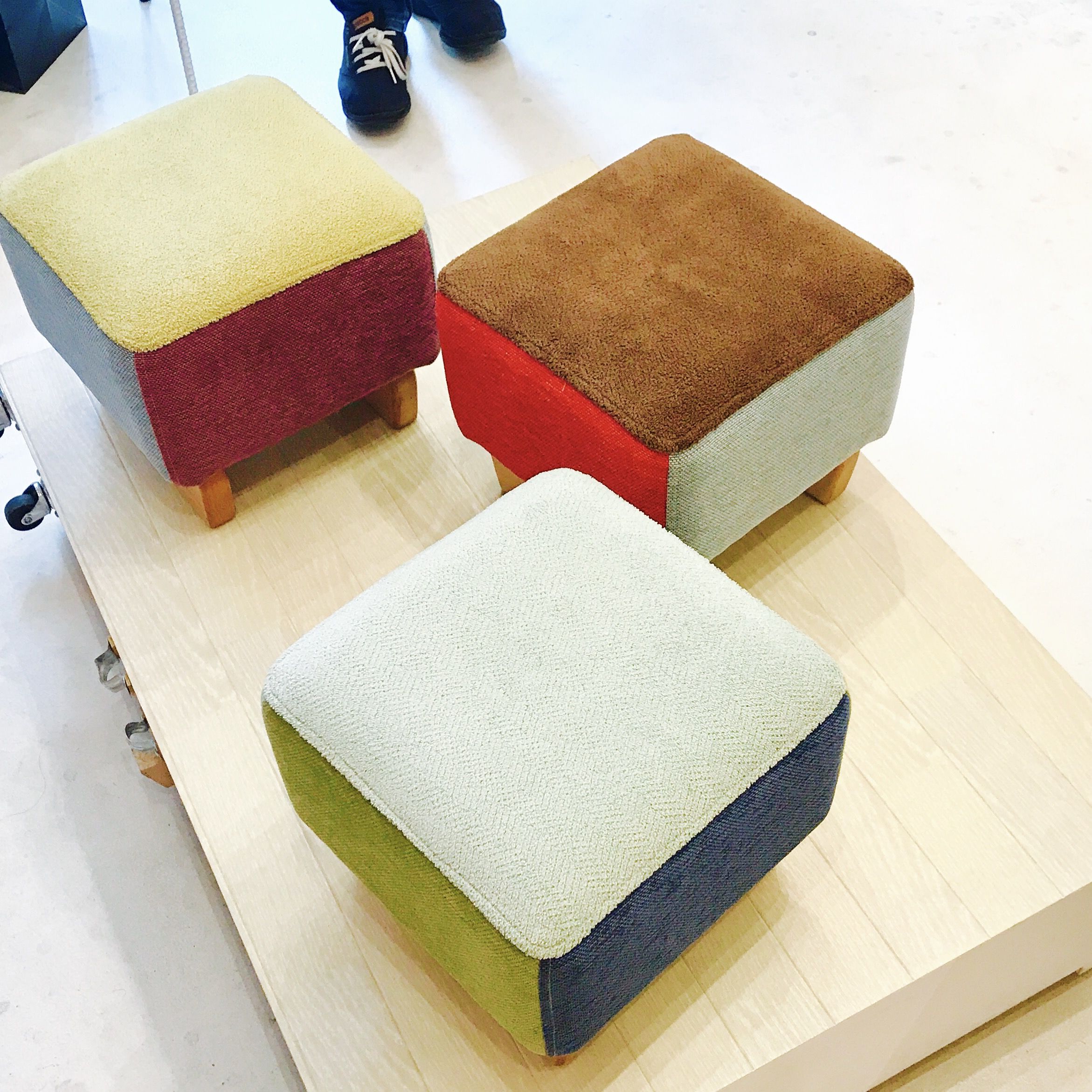 モンペスツールのファブリックは、座面に1色、側面に2色の色をつかっていて、とってもカラフル。そのため、見る角度によって印象が変わります。