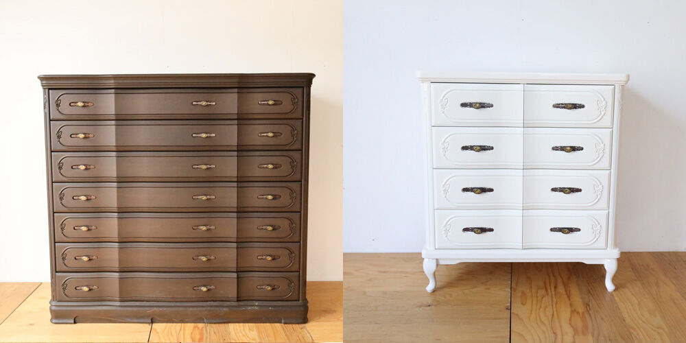ミルキーホワイトに塗装したことで、ヨーロピアン調のチェストに生まれ変わりました。