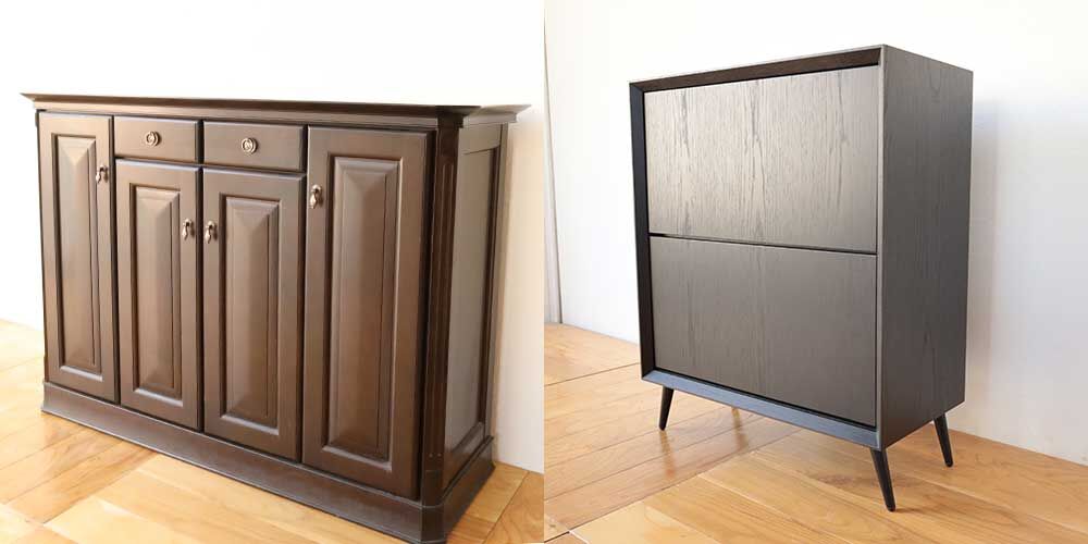 たとえばこんなリメイク。クラシカルな雰囲気の婚礼家具の下駄箱を、モダンな雰囲気のリビングボードにリメイクしました。ぐっとスッキリとした印象になり、スタイリッシュに生まれ変わりましたね!