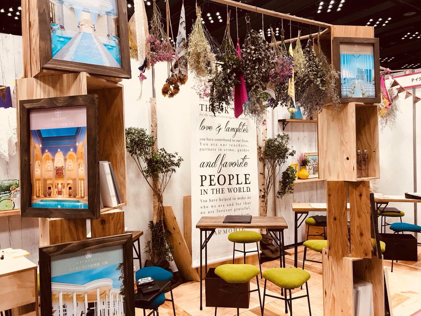 他にもこのゼクシィフェスタ関西『テイクアンドギヴ・ニーズ』様のブースにはたくさんの工夫や仕掛けがあるんですが、一番空間にインパクトを与えているのはやっぱりこのハンギングフラワーですよね。