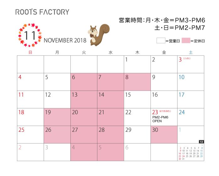 やったー!10月いっぱいは金土日のみのオープンでしたが、来週から月木もオープンしちゃいますよー!11月の営業は