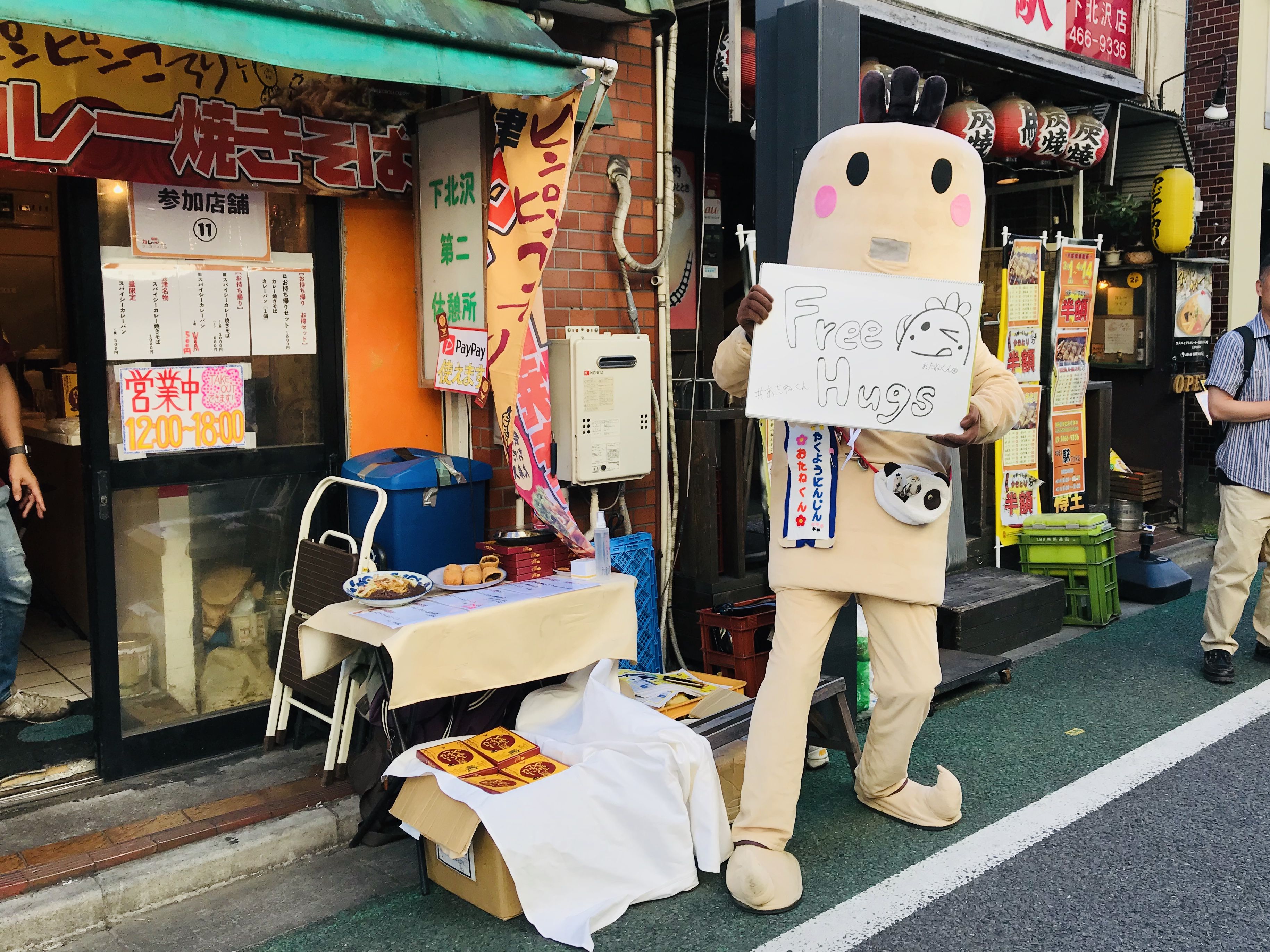 シモキタベースのご近所には、会津のゆるキャラ「おたねくん」が!会津産オタネニンジンを使った「ピンピンころりカレー」のPRで来ていたみたい。